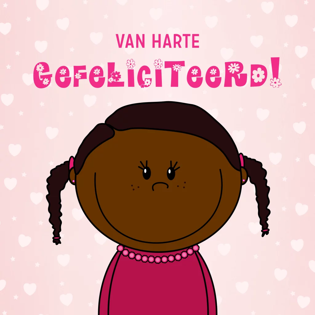 Vrolijke, roze verjaardagskaart met hartjes en een tekening van een lief, blij meisje met twee staartjes.