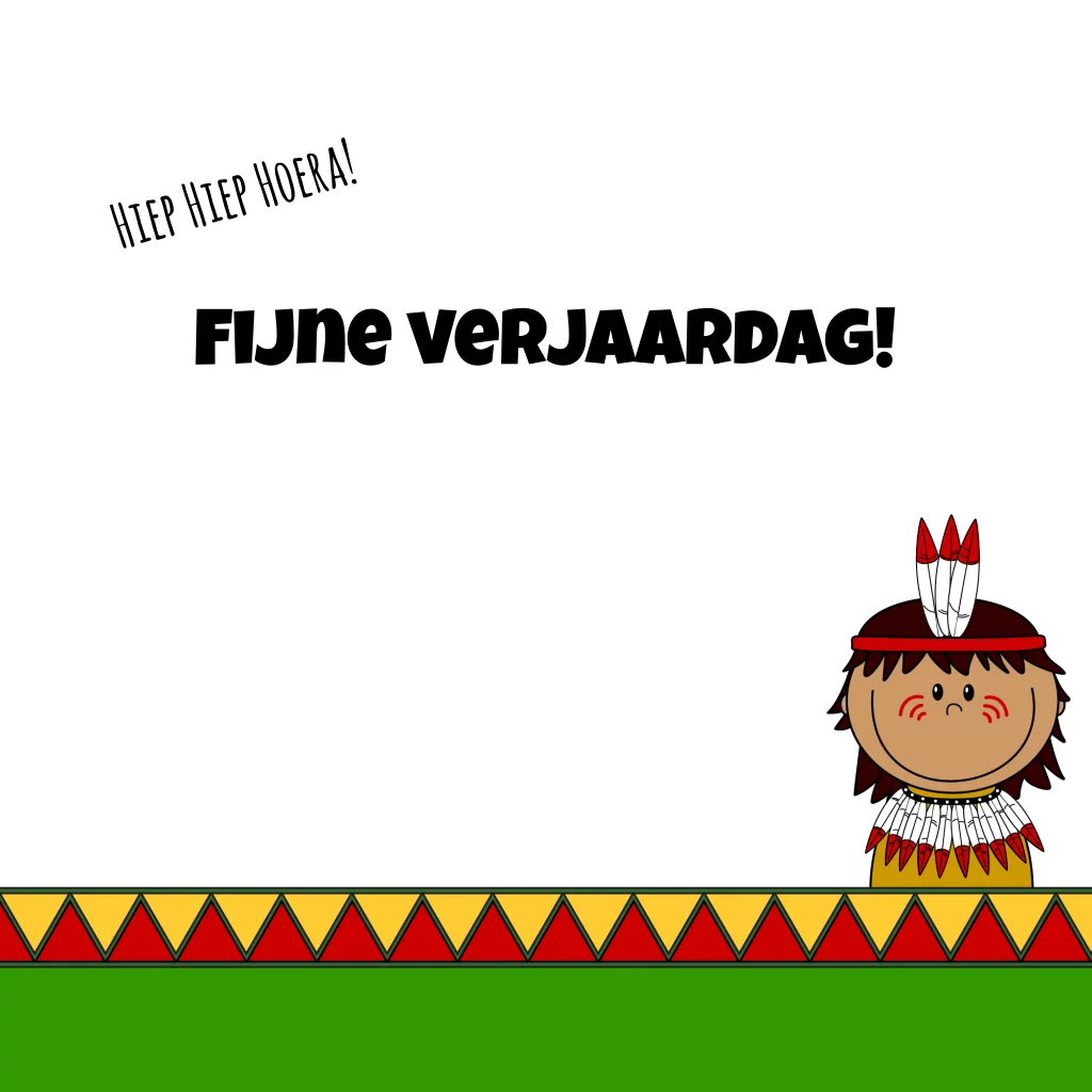 Verjaardagskaart voor kleine stoere jongens. Deze kaart heeft een illustratie van een vrolijke indiaan met een indianentooi met 3 veren.