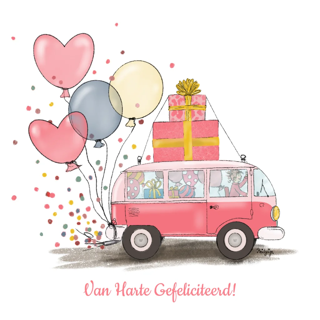 Verras de jarige met deze vrolijke verjaardagskaart met een roze volkswagen bus met ballonnen, cadeautjes en confetti. Pas de teksten op de kaart naar wens aan en laat jouw felicitatie direct naar de jarige verzenden.