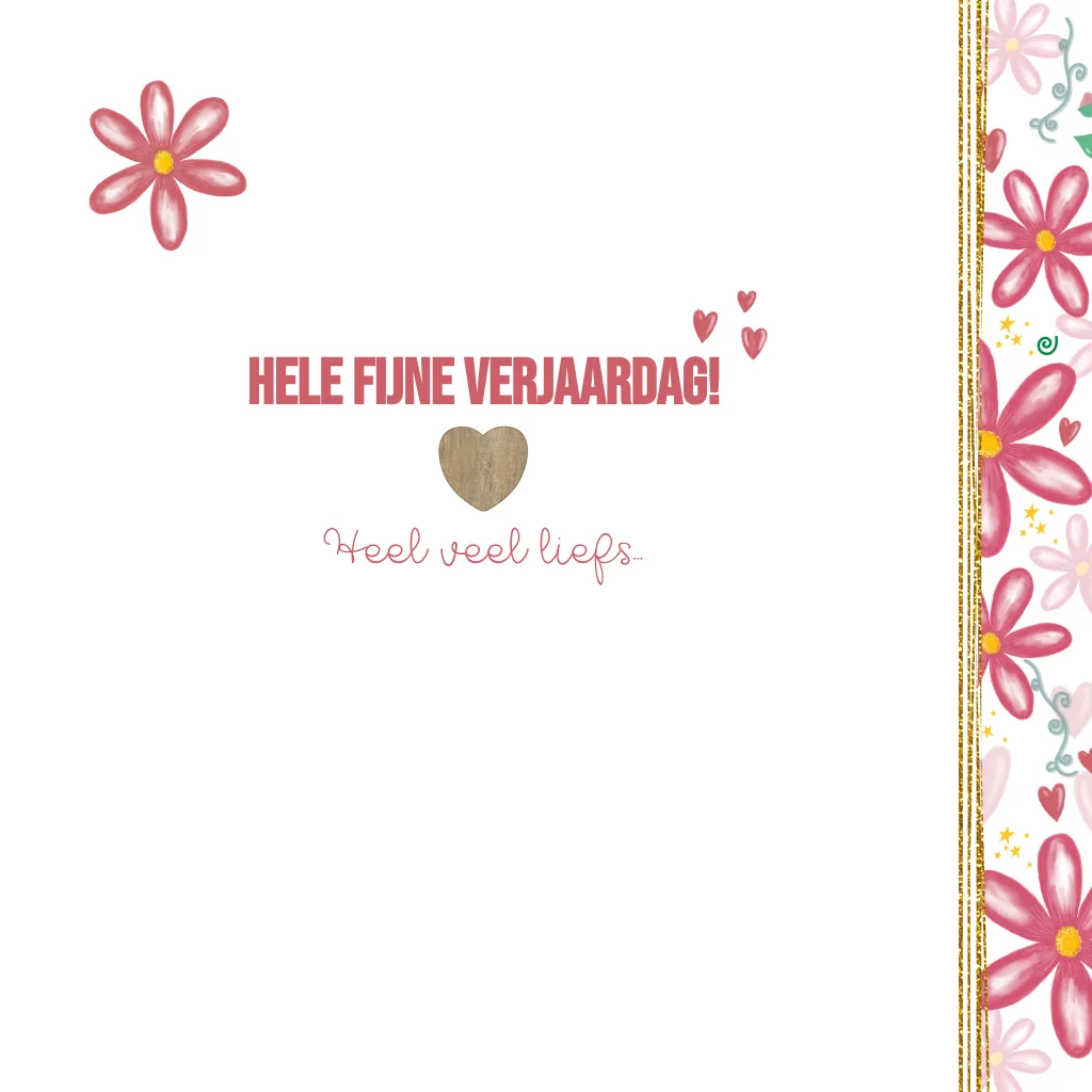 Fleurige verjaardagskaart met vele bloemetjes en hartjes en een groot houten hart met een tekst.