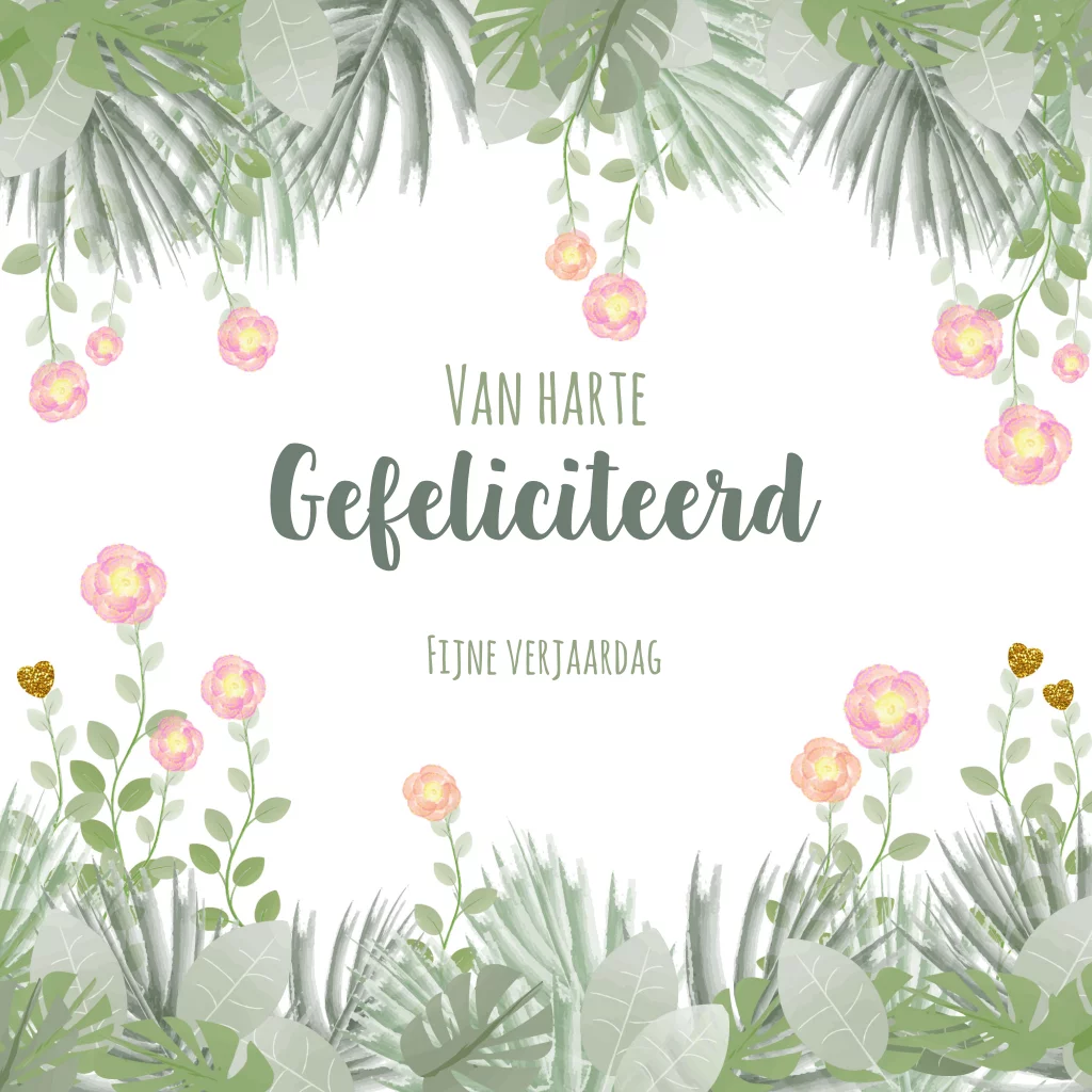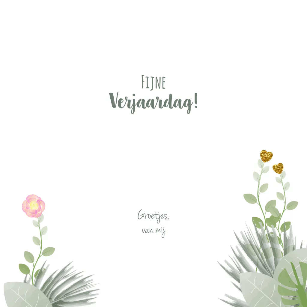 Fleurige en frisse verjaardagskaart in botanische stijl met bladeren, bloemen en goudkleurige glitter hartjes. (Geen echte glitters) Tip: maak je kaart extra persoonlijk door de naam van de jarige op de voorkant van de kaart te plaatsen.