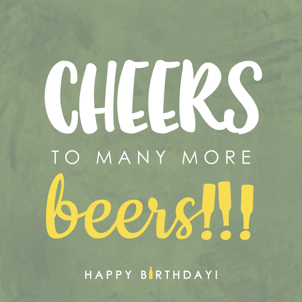 Maak iemands verjaardag extra vrolijk met onze grappige verjaardagskaart speciaal voor mannen! Met een groene achtergrond voorzien van structuur en een gevatte boodschap, "Cheers to many more beers," is deze kaart perfect voor de bierliefhebber in je leven. Het geheel wordt aangevuld met een illustratie van een bierflesje in silhouet. Je kunt deze kaart volledig aanpassen naar jouw wensen en met één klik direct naar de jarige laten verzenden. Een humoristische en persoonlijke manier om iemand te feliciteren op hun speciale dag!