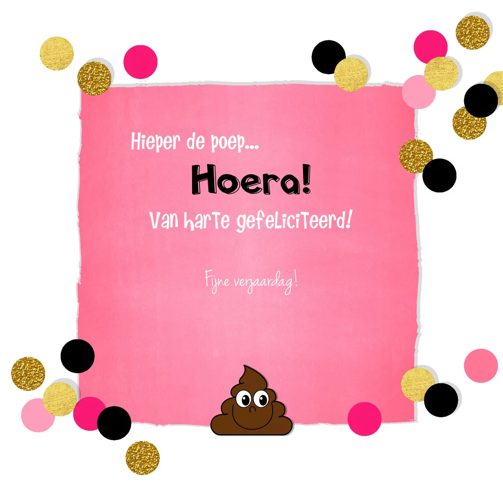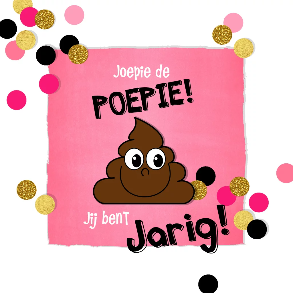 Joepie de POEPIE jij bent jarig! Meisje. Grappige, roze verjaardagskaart met een emoji drol en confetti. De goudkleurige glitters zijn geen echte glitters, maar worden gedrukt.