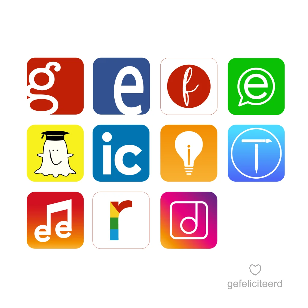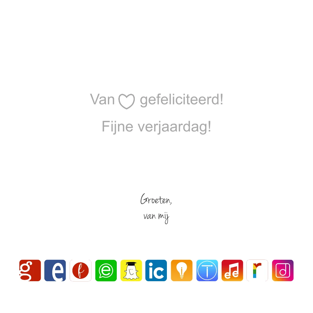 Hippe en trendy verjaardagskaart met de bekende app icoontjes. Gefeliciteerd.
