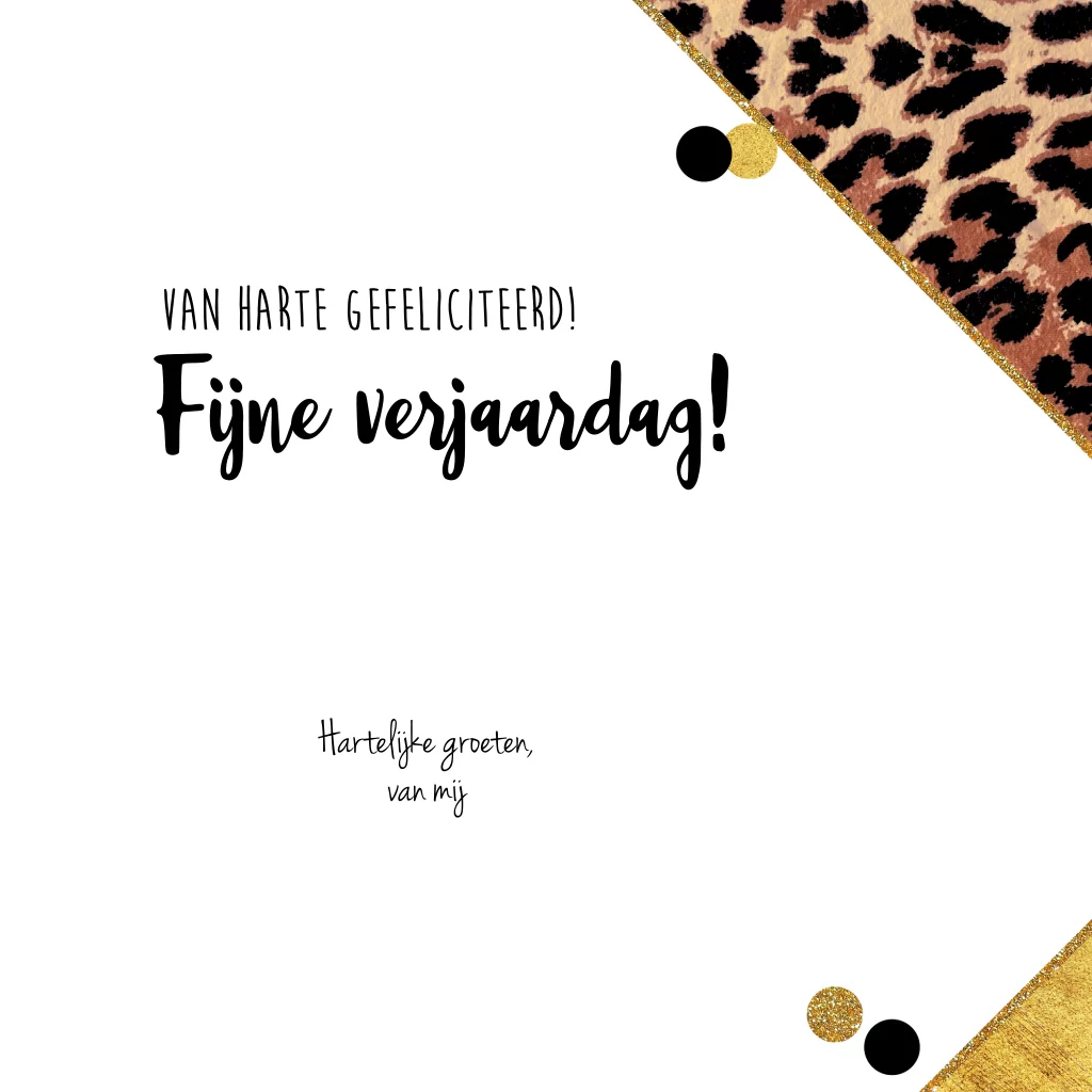Hippe verjaardagskaart met panterprint, confetti en goudkleurige glitter tekst. (geen goudinkt of echte glitters)