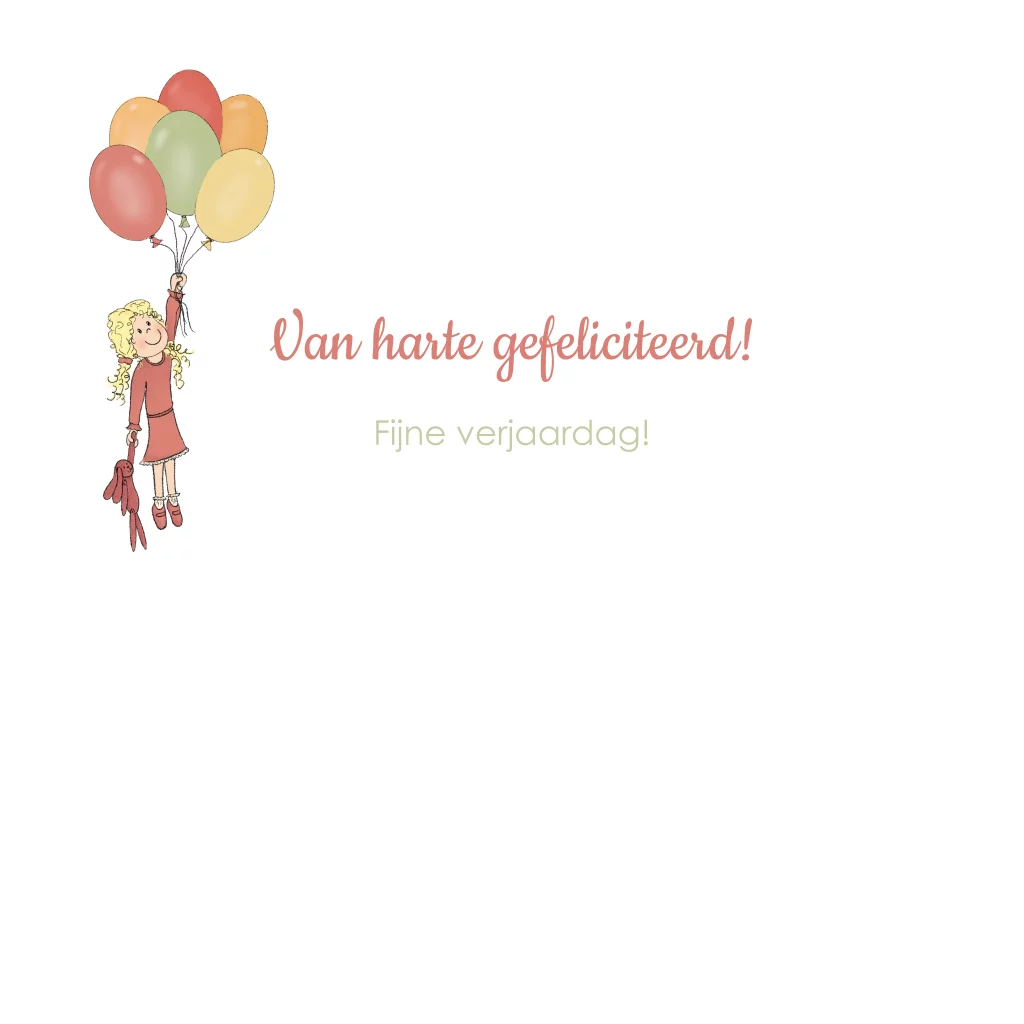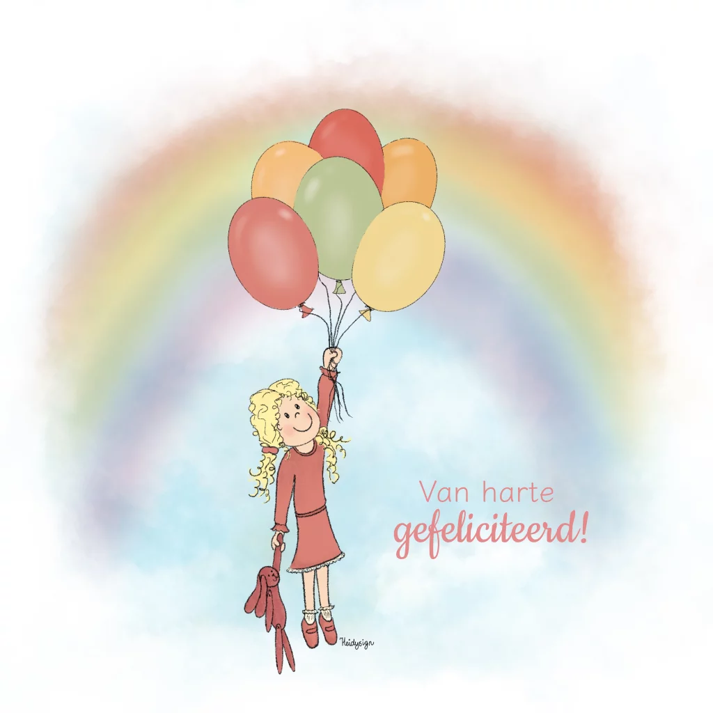 Een vrolijk meisje zweeft hoog tussen de wolken en regenboog, vastgehouden door kleurrijke ballonnen en haar trouwe knuffelkonijn in de hand. Deze lieve, speelse kaart is perfect voor een kind dat houdt van avontuur en fantasie! Voeg gemakkelijk je eigen tekst toe aan de voorkant, zoals de naam van de jarige. Nog handiger: wij verzenden de kaart rechtstreeks naar de gelukkige! Klaar om iemands verjaardag écht onvergetelijk te maken?