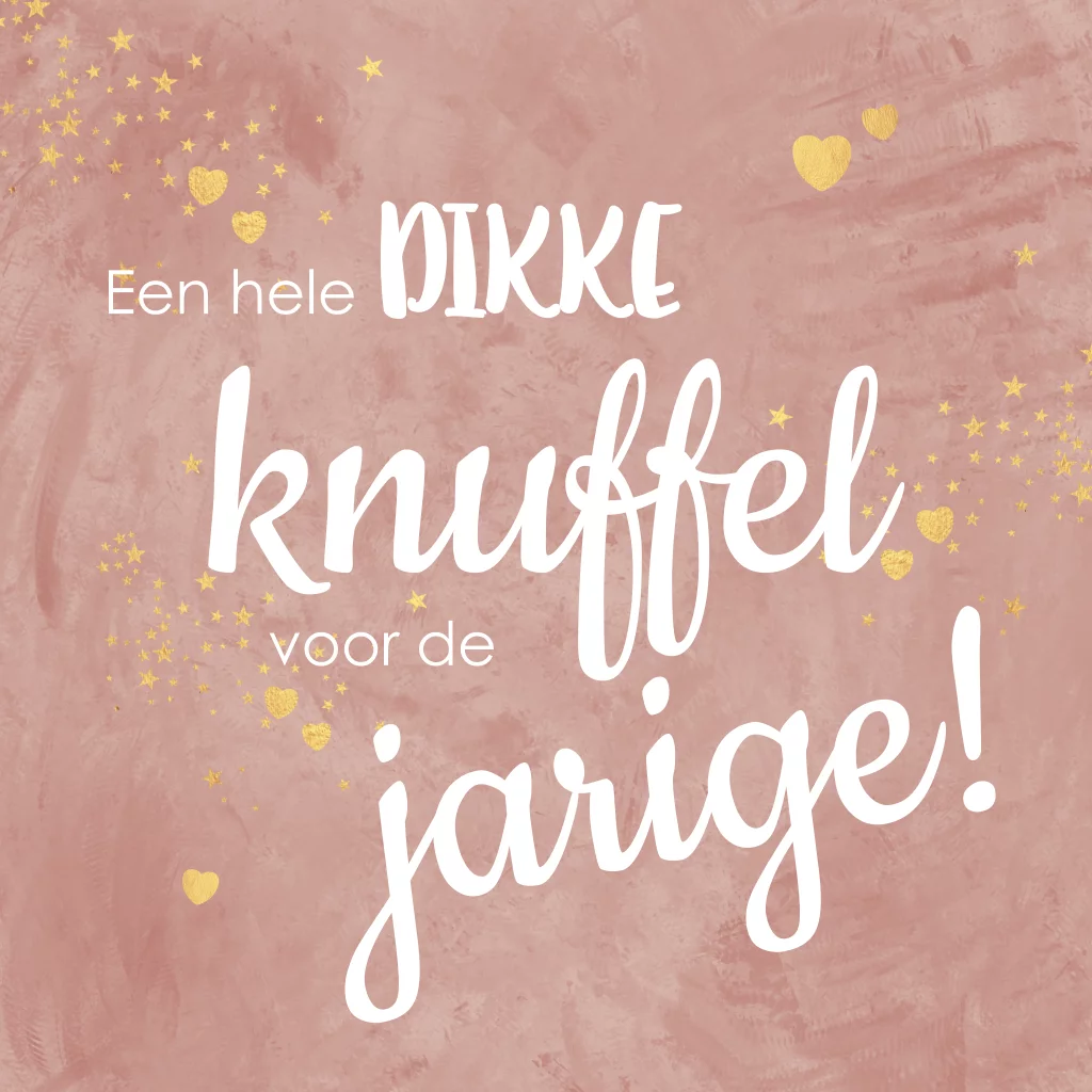 Verras de jarige in stijl met onze oudroze verjaardagskaart! Deze kaart heeft een stoere structuur en een vlotte, frisse uitstraling. Versierd met schitterende gouden sterretjes en hartjes, trekt deze kaart zeker de aandacht. Maar het hoogtepunt is de grote, liefdevolle boodschap: "Dikke knuffel voor de jarige". En het beste van alles? Je kunt de kaart volledig aanpassen naar jouw wensen en ervoor kiezen om deze direct naar de jarige te laten verzenden. Een perfecte manier om iemand speciaal te verrassen op hun verjaardag!