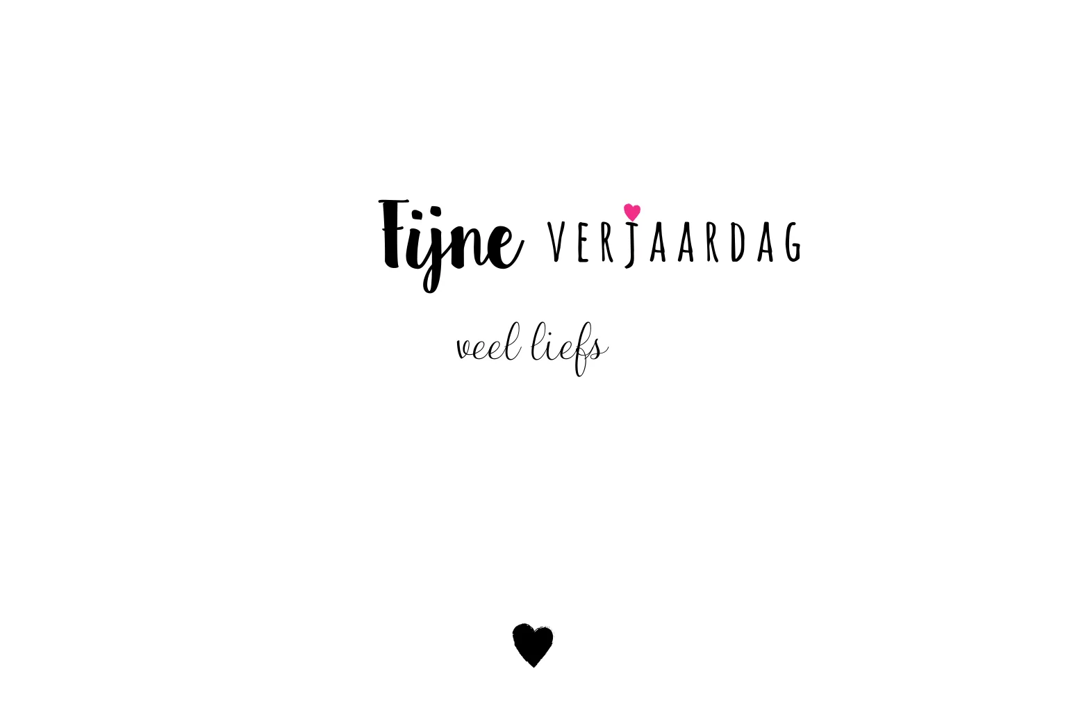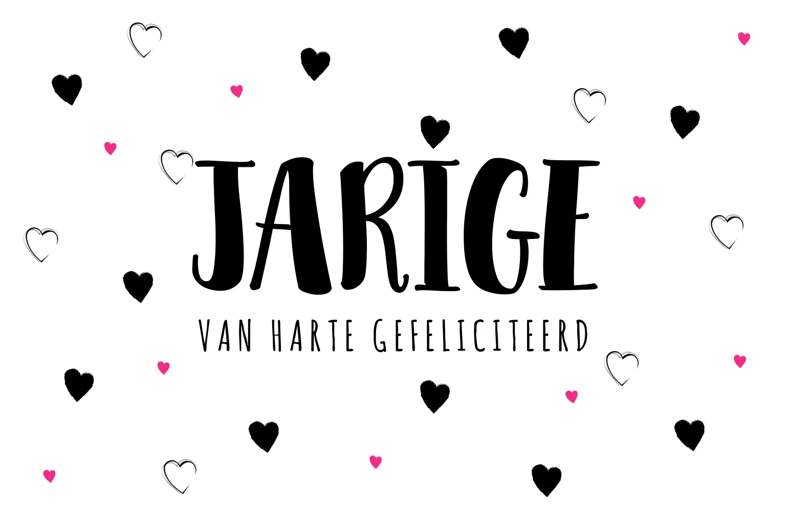 Trendy zwart-wit verjaardagskaart met een vleugje roze. Speciaal voor de jarige een felicitatie kaart met vele hartjes.