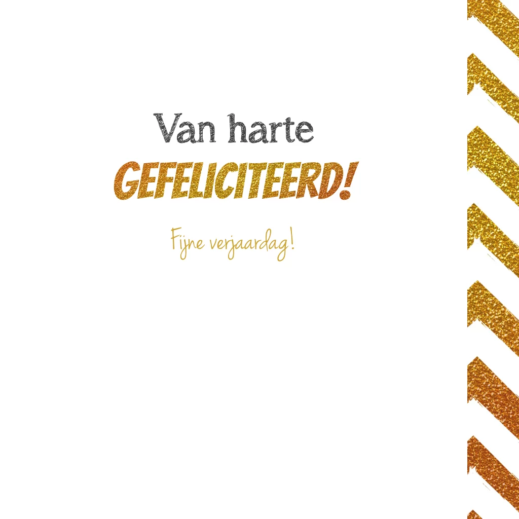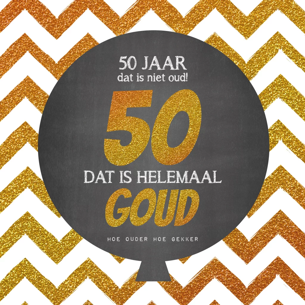 50 jaar! Dat is helemaal goud! Vrolijke verjaardagskaart om iemand die 50 jaar wordt te feliciteren. De wenskaart met goudkleurig zigzag patroon en een krijtbord ballon heeft een grappige tekst. Deze tekst kan worden aangepast.