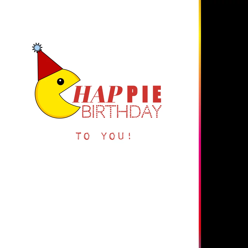 Vrolijke verjaardagskaart met een grapje. Deze feestelijke kaart heeft een vrolijke illustratie van een game, met een smiley, taart en cadeautjes. Afgeleid van Pacman.