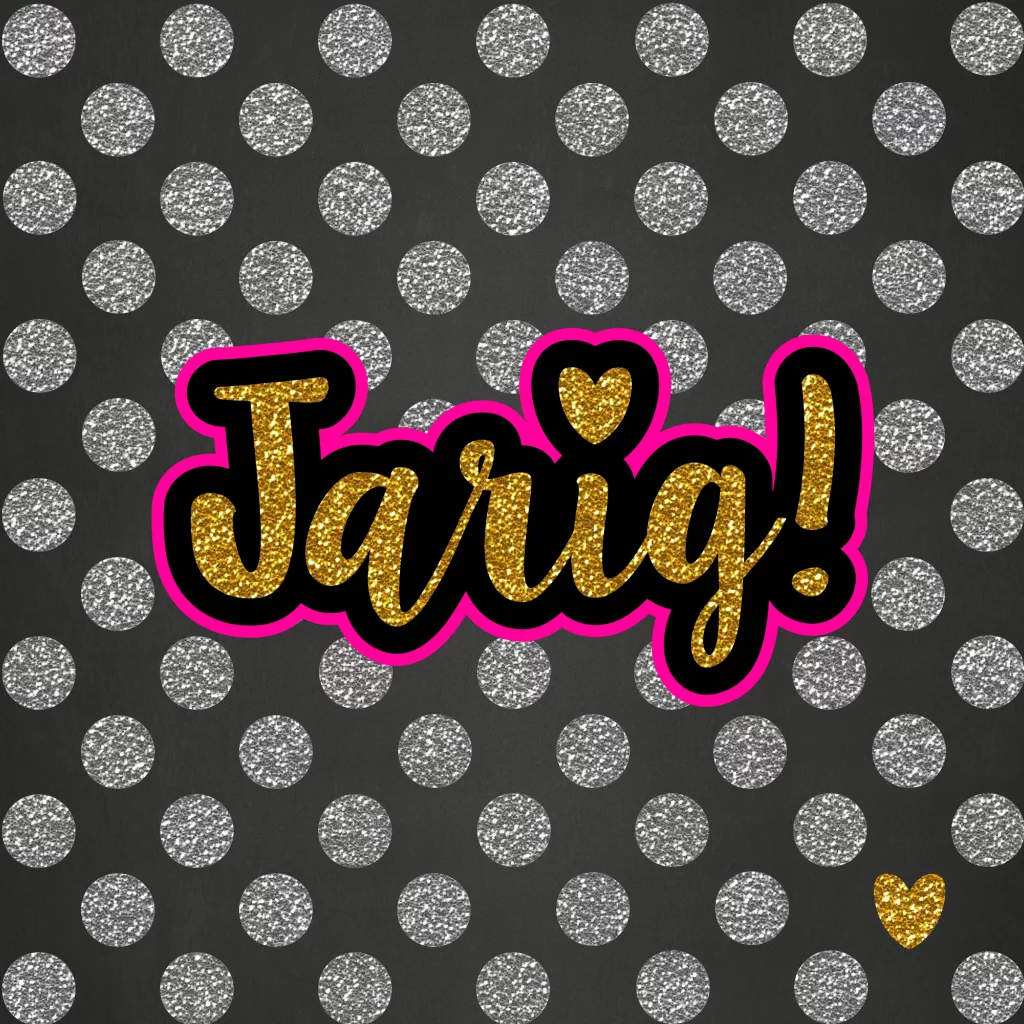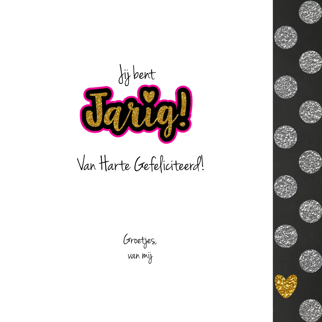 Vrolijke, hippe verjaardagskaart met zilver kleurige stippen en met goudkleurige letters het woord: Jarig met een hartje. (Glitters zijn niet echt.)