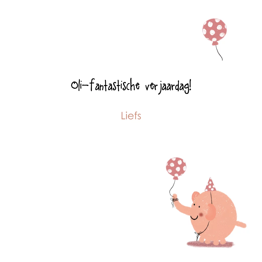 Grappige verjaardagskaart met een woordgrapje, een schattig olifantje en een ballon. Pas deze leuke verjaardagskaart naar wens aan en laat de kaart direct nar de jarige verzenden. Wie wens jij een oli-fantastische verjaardag?