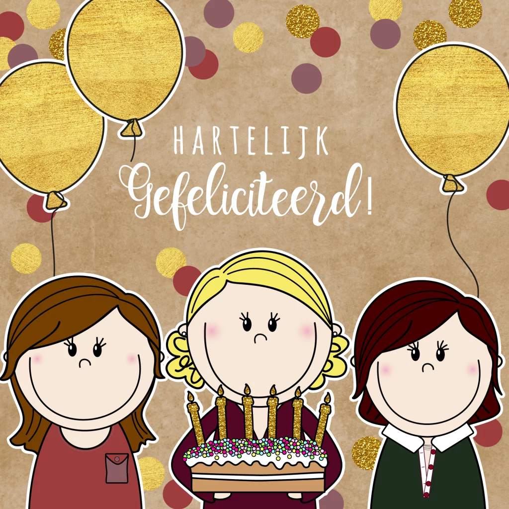 Feestelijke verjaardagskaart voor vrouwen met een illustratie van 3 vrouwen met taart ballonnen en confetti.