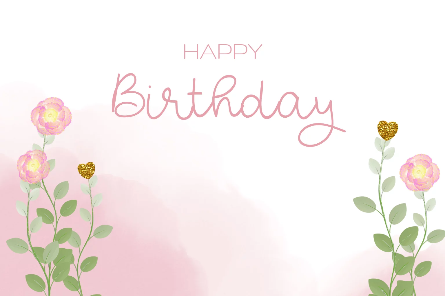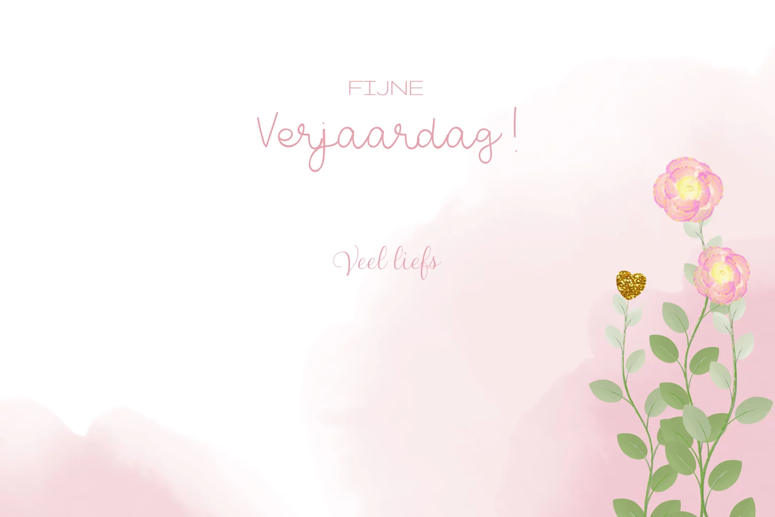Fleurige verjaardagskaart met roze waterverf, bloemen en goudkleurige hartjes. De teksten op de kaart kunnen worden aangepast. (geen goudfolie)