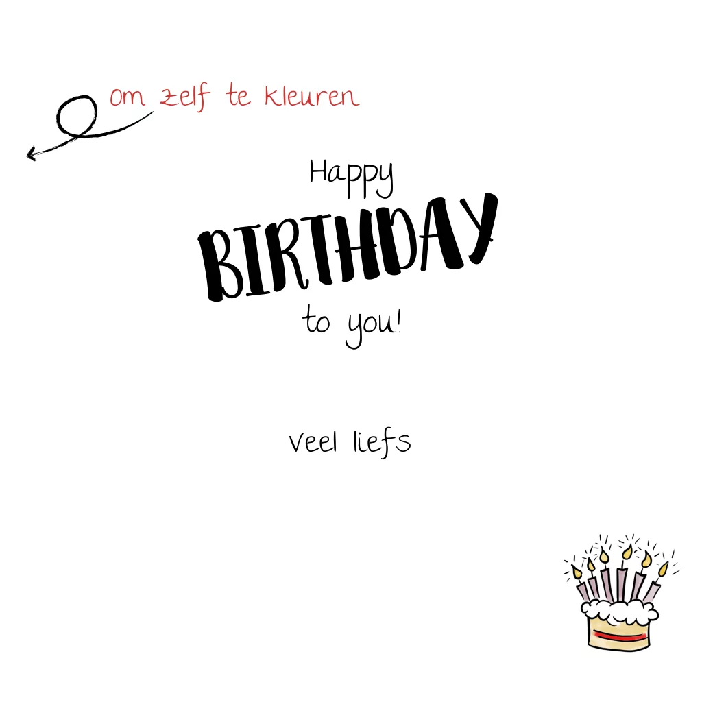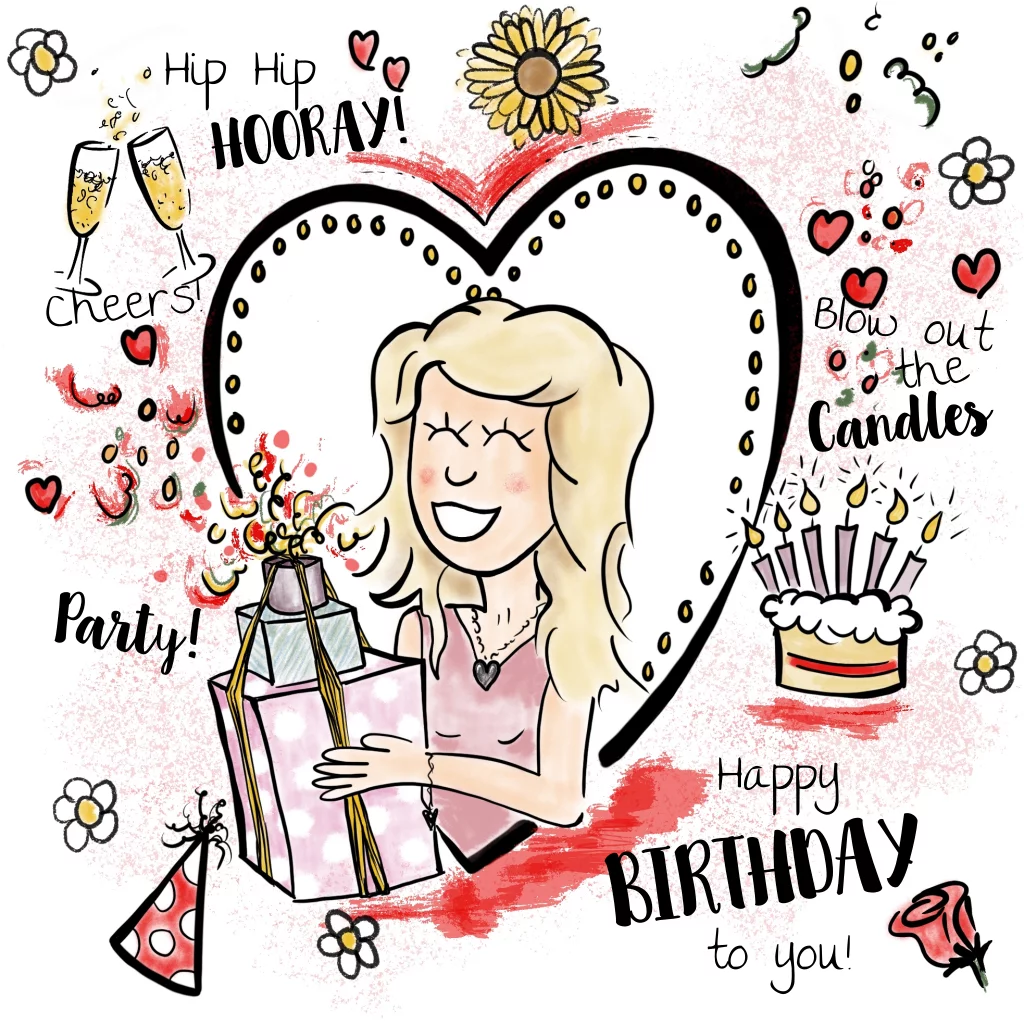 Vrolijke verjaardagskaart met een tekening in handlettering-stijl. Op deze wenskaart staat een tekening van een vrouw met cadeautjes, hartjes, confetti, verjaardagstaart, feesthoed en champagne. TIP: Pas de tekst rechts onderaan aan en plaats daar de naam van de jarige. Zo maak je de kaart extra persoonlijk.