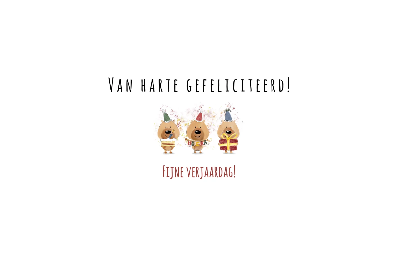 Naar welk feestbeest stuur jij deze vrolijke verjaardagskaart? Deze leuke verjaardagskaart heeft een grappige tekening van drie feestbeesten met een taart, slinger en een cadeau. Je past deze kaart eenvoudig naar wens aan en laat hem met gemak door ons verzenden naar de jarige.