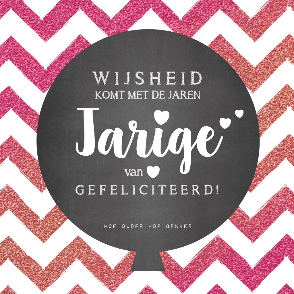 Vrolijke, gekleurde verjaardagskaart met een zig-zag patroon en een krijtbord ballon met daarop een grappige tekst. Wijsheid komt met de jaren... hoe ouder hoe gekker.