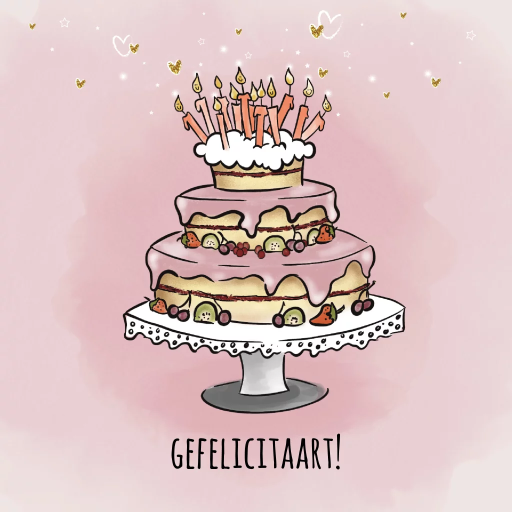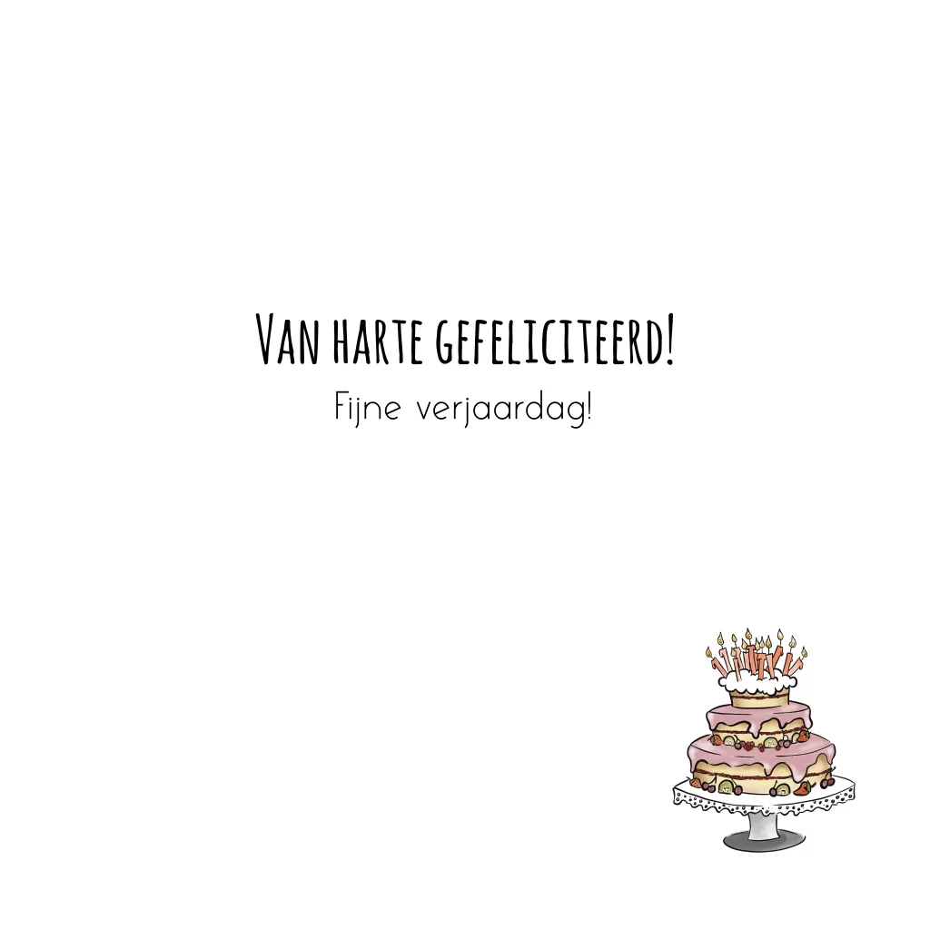 Gefelicitaart! Deze zoete verjaardagskaart heeft een tekening van een verjaardagstaart met vele kaarsjes. Wie van jouw vriendinnen mag bij jou de kaarsjes uitblazen? Plaats een persoonlijke boodschap op de kaart en laat deze kaart direct naar de jarige verzenden.
