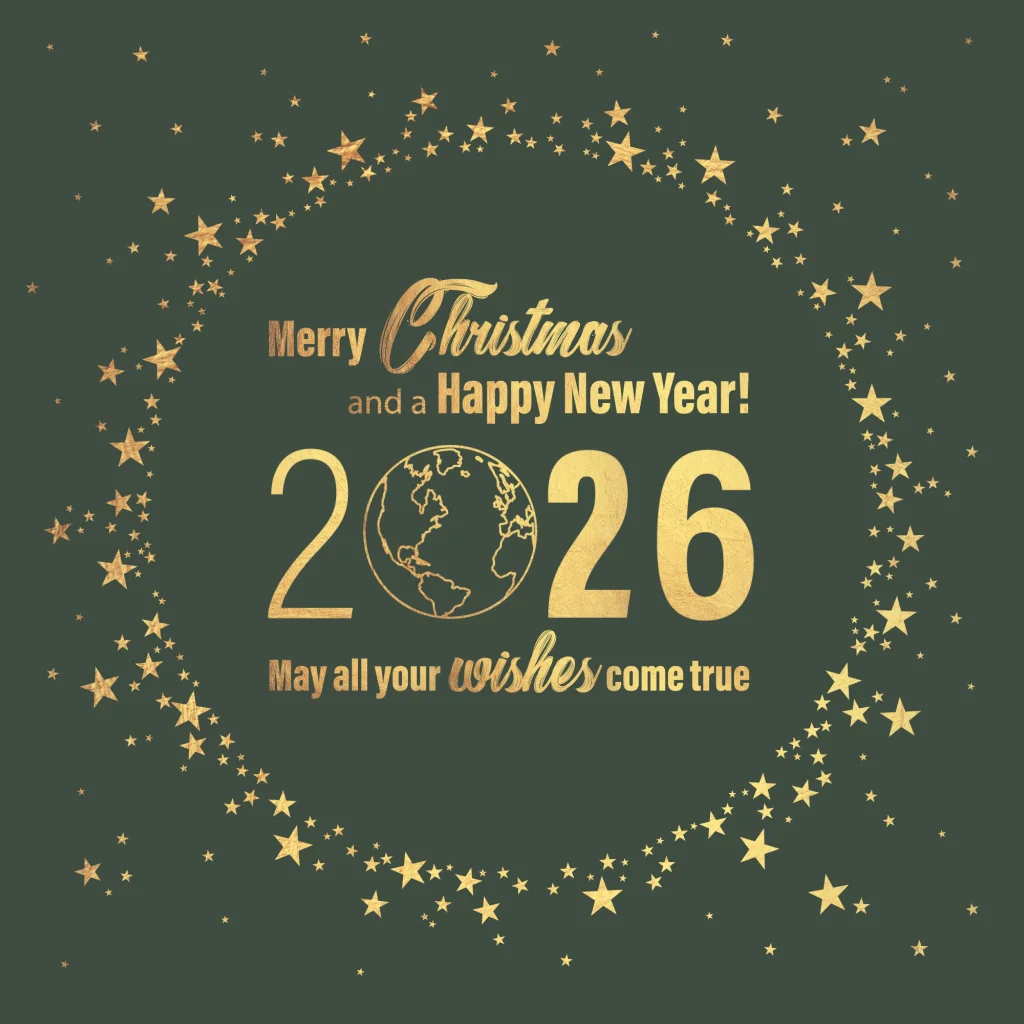 Stijlvolle kerstkaart en nieuwjaarskaart 2026. Stijlvolle, typografische donkergroene kerstkaart met goudkleurige sterren, tekst en een wereldbol. De achtergrondkleur kun je zelf naar wens aanpassen. Deze kaart kun je rechtstreeks laten verzenden.