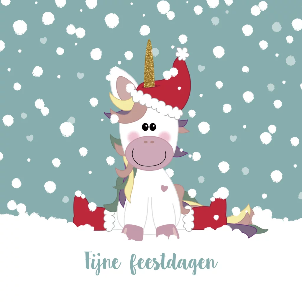 Kerst wenskaart met een unicorn in de sneeuw. Winterse kerstkaart met een schattige unicorn en sneeuwvlokken die je zelf nog kunt verplaatsen. Je kunt de naam van de ontvanger toevoegen aan de kaart.