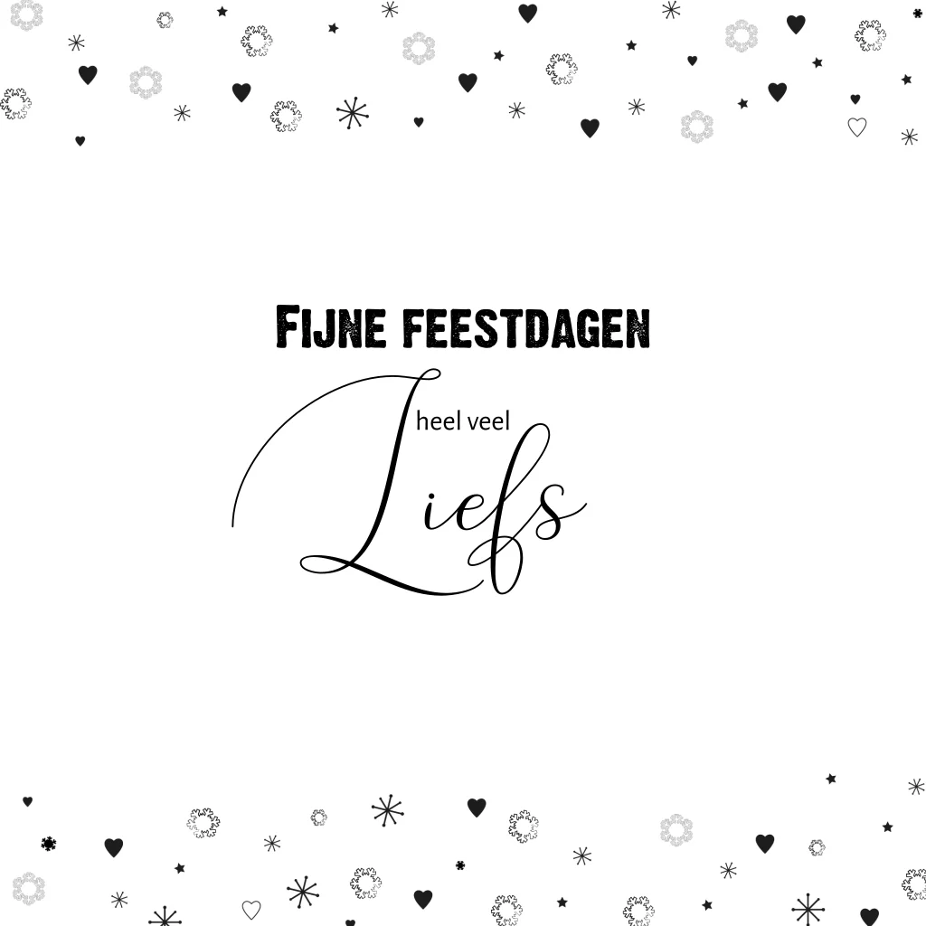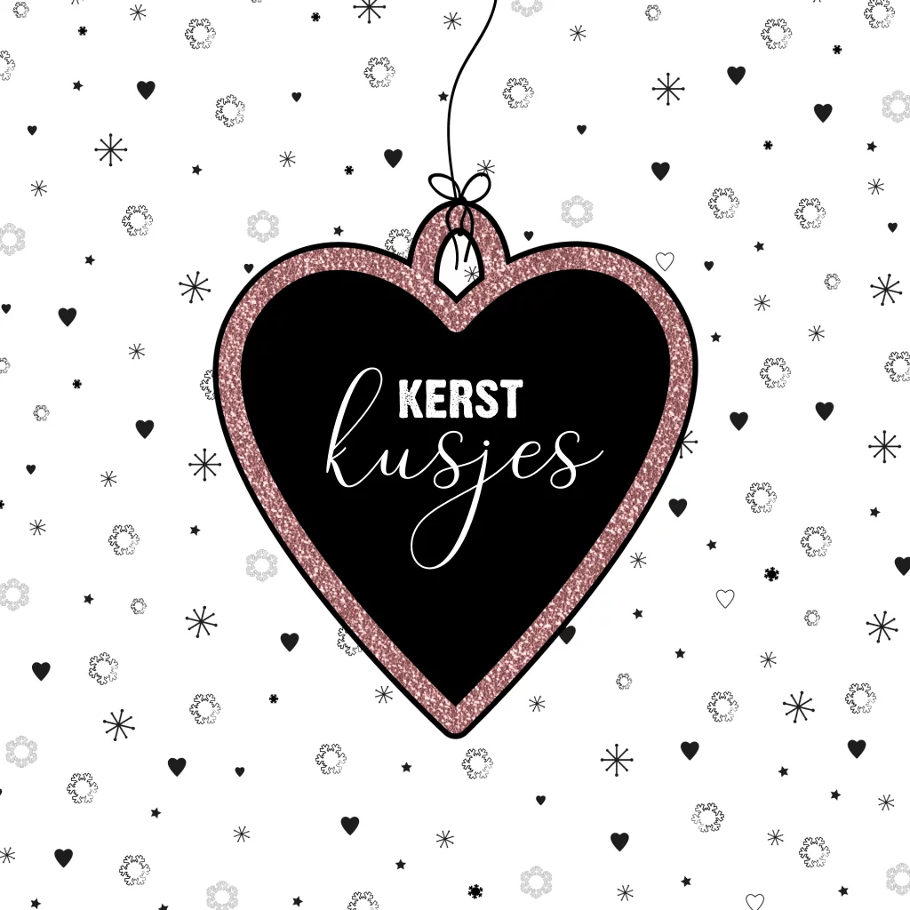 Kerst wenskaart. Hippe kerstkaart met een zwart-wit patroon van hartjes, sterren en sneeuwvlokken en een groot hart met de tekst: Kerst kusjes. Pas de kaart naar wens aan en verras iemand met een leuke kerstkaart in de brievenbus.