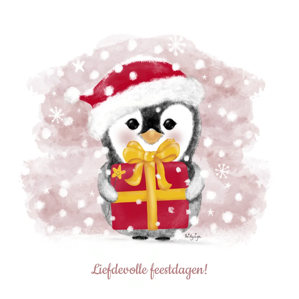 Verstuur een dosis feestelijke vreugde met onze schattige kerstkaart! Een liefdevol getekende, pluizige pinguïn met een kerstmuts en cadeautje straalt warmte uit op een sneeuwachtige achtergrond. Pas de kaart naar wens aan en deel deze betoverende kerstgroet met je dierbaren. Een kerstgroet met een dosis knuffelige gezelligheid!