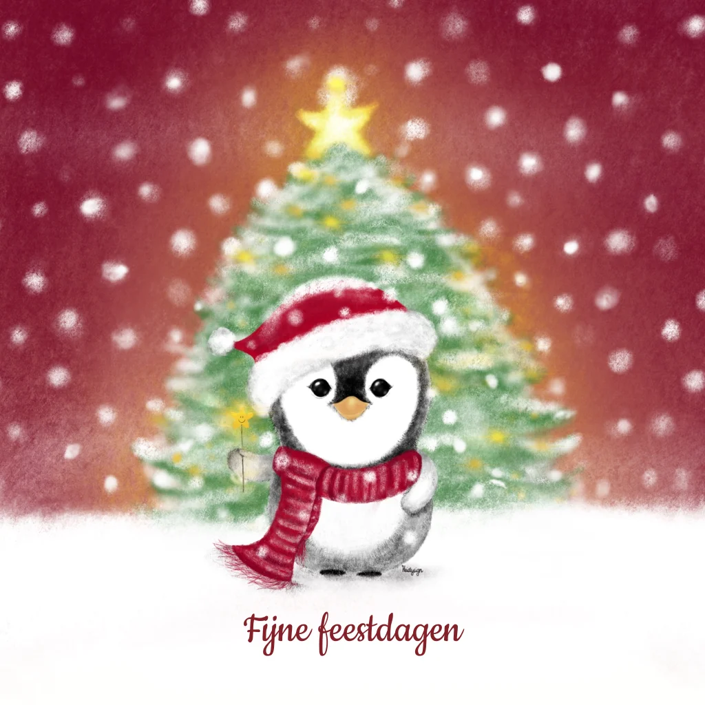 Breng een vleugje winterse magie in je kerstgroeten met deze betoverende kaart! De tekening van een grote kerstboom vol lichtjes, een schattige fluffy pinguïn met een fonkelend sterretje, en een diepe donkerrode achtergrond met zachte sneeuwvlokken creëert een sprookjesachtige sfeer.
