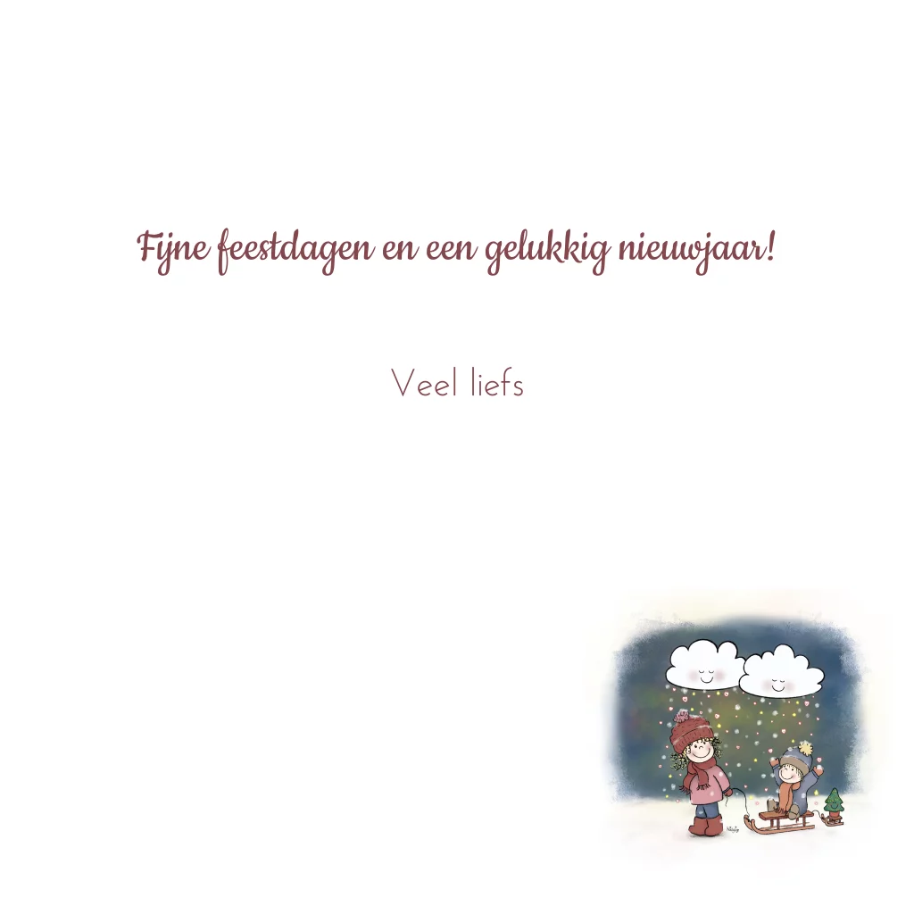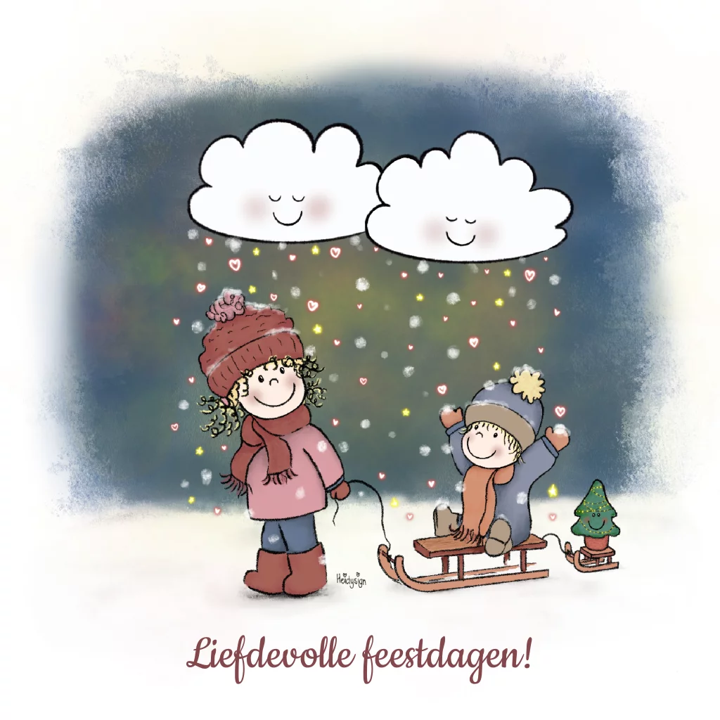Breng de magie van Kerstmis naar kinderen met onze schattige kerstkaart! De kaart toont een lief tafereel van een meisje en een jongen op een slee, met een kerstboompje onder een hemel van hartvormige sneeuwvlokken. Pas de kaart moeiteloos aan naar wens en laat hem direct verzenden voor een betoverende en persoonlijke kerstgroet. Maak de feestdagen extra bijzonder met deze aanpasbare en speelse kerstkaart voor kinderen!