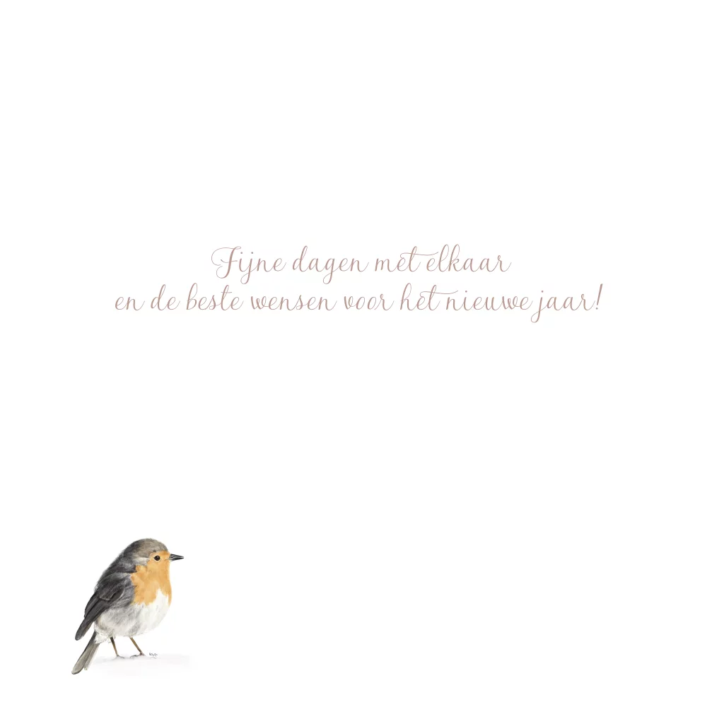 Stijlvolle kerstkaart met een realistische tekening van een lief roodborstje in de sneeuw en een oudroze achtergrond kleur. Pas deze mooie kerstkaart naar wens aan en voorzie deze van een persoonlijke kerstwens. Bij wie laat jij dit lieve vogel kaartje bezorgen?