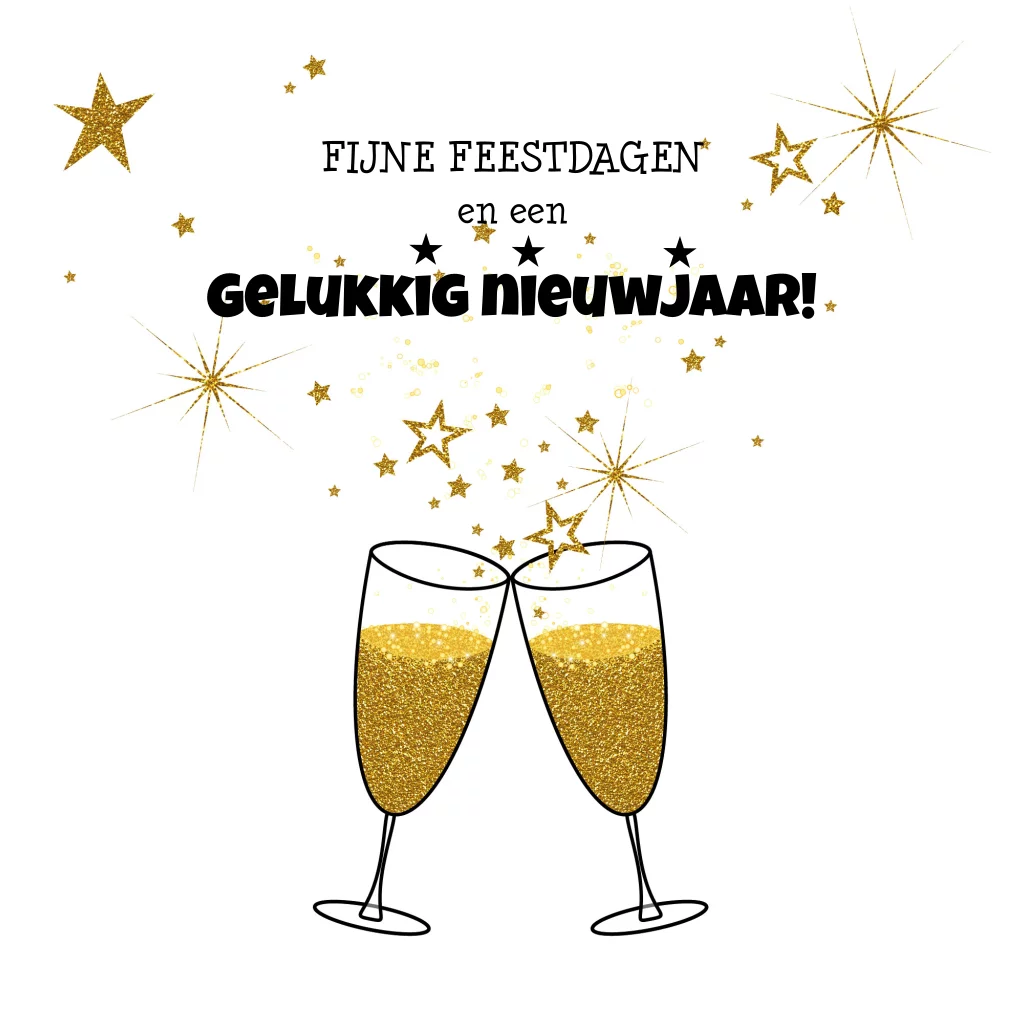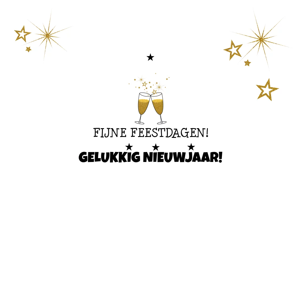 Stuur een trendy nieuwjaarskaart met een illustratie van twee champagneglazen en goudkleurige glitter sterren. Pas de kaart naar wens aan en laat deze direct verzenden om het nieuwe jaar stijlvol te vieren.