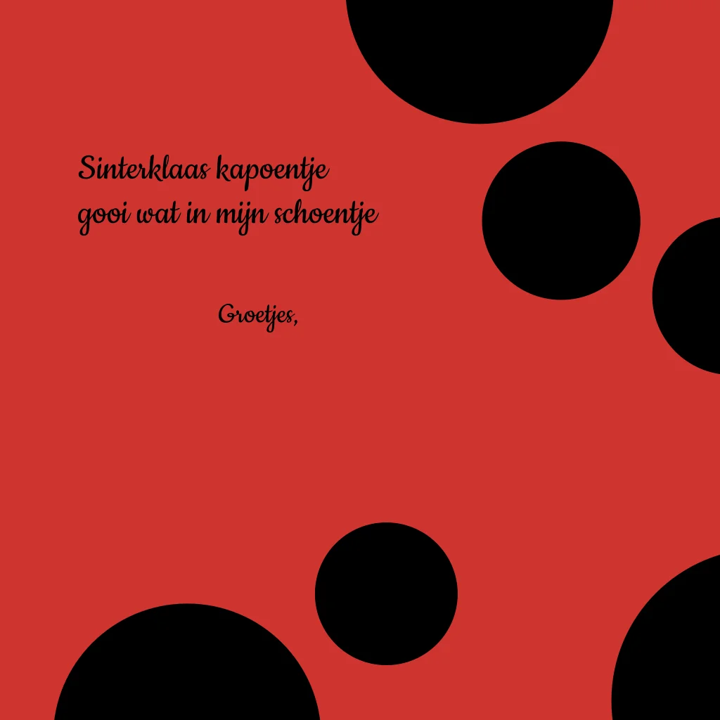 Breng een glimlach op het gezicht van iemand die wel van een grapje houdt met onze grappige Sinterklaaskaart! De kaart, rood met zwarte stippen, brengt de vrolijke sfeer van het feest naar voren met de bekende spreuk 'Sinterklaas Kapoentje, Gooi Wat in Mijn Schoentje'. Pas de kaart gemakkelijk naar wens aan en voeg een persoonlijk tintje toe aan deze humoristische groet. Verzend de kaart direct voor een feestelijke verrassing tijdens de Sinterklaasperiode. Maak de feestdagen nog gezelliger met deze unieke en aanpasbare Sinterklaaskaart!