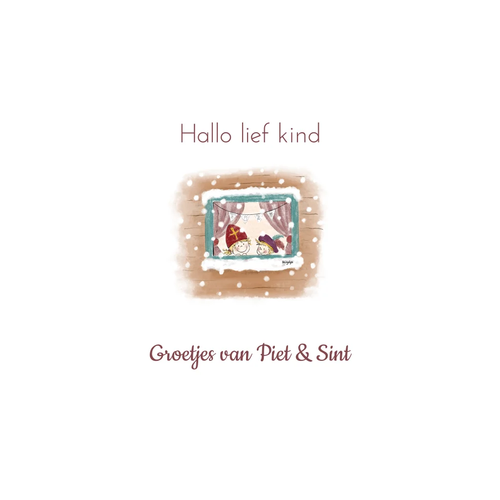 Verspreid Sinterklaasvreugde met onze unieke Sinterklaaskaart! Deze kaart, met groeten van Sint en Piet, toont een schattige tekening van een meisje en een jongen, verkleed als Sint en Piet. Ze kijken uit het raam, in afwachting van Sinterklaas. Pas de kaart naar wens aan en voeg een persoonlijk tintje toe aan deze feestelijke groet. Verzend de kaart direct voor een warme en betoverende Sinterklaasverrassing. Maak deze kaart helemaal van jou met onze aanpasbare opties en geniet van de magie van het feest!