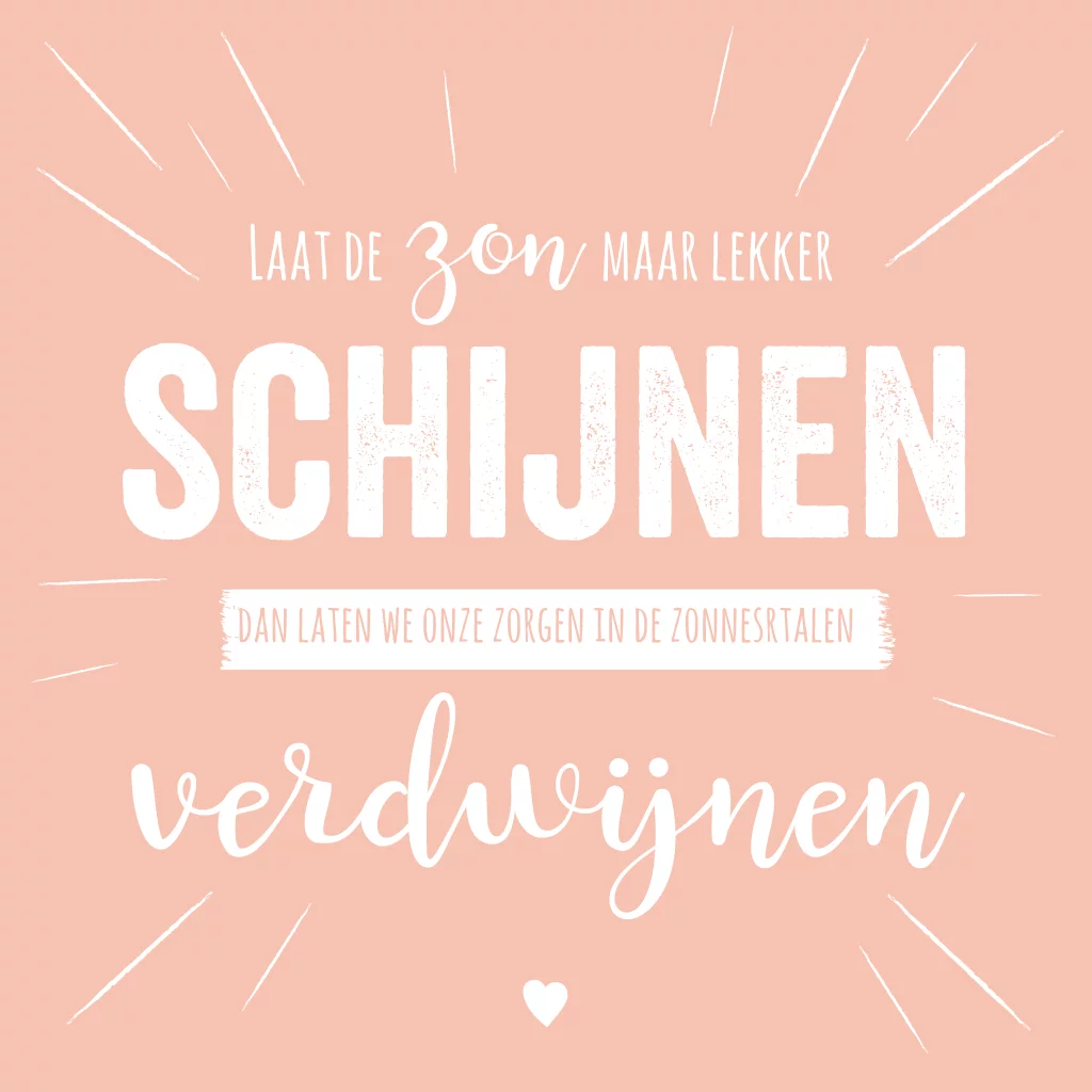 Ken jij iemand die wel een steuntje in de rug kan gebruiken? Verras diegene met deze leuke wenskaart met een positieve tekst; " Laat de zon maar lekker schijnen, dan laten we onze zorgen in de zonnestralen verdwijnen". Je kunt de tekst en de kleur naar wens aanpassen. Met deze kaart weet je zeker dat je de ontvanger kan opbeuren of een glimlach op het gezicht kan toveren.