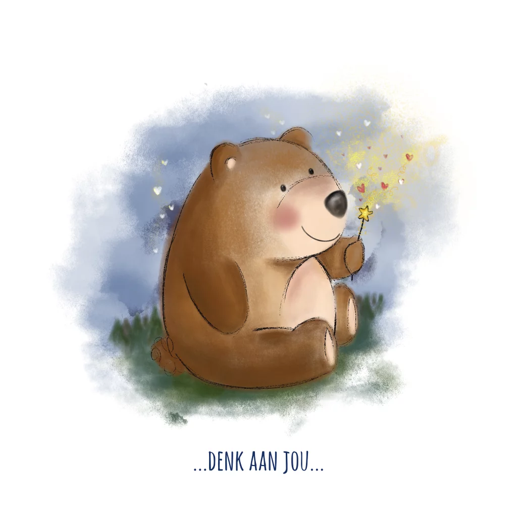 Wenskaart - medeleven. Schattig kaartje met een getekend, lief beertje met sterretjes en hartjes. Stuur deze kaart naar iemand om te laten weten dat je aan deze persoon denkt. Je kunt de tekst eenvoudig aanpassen.