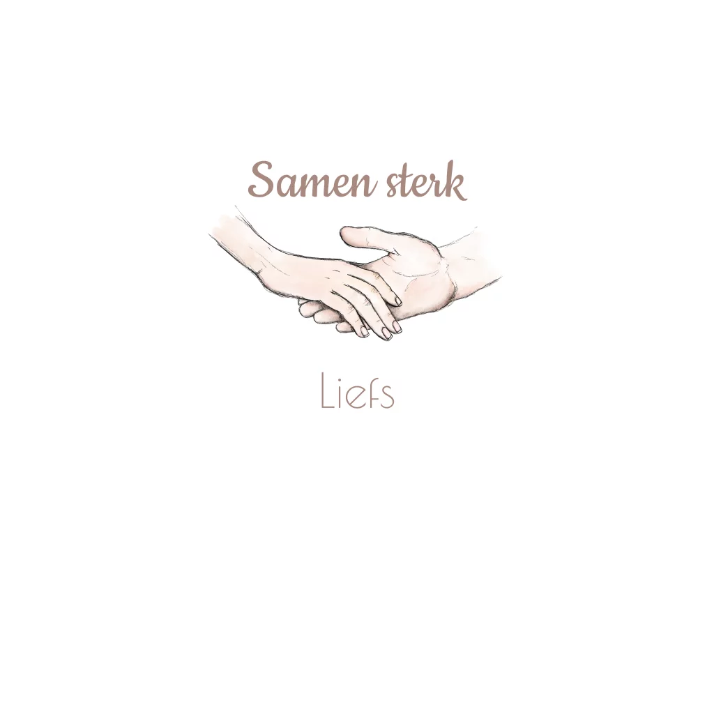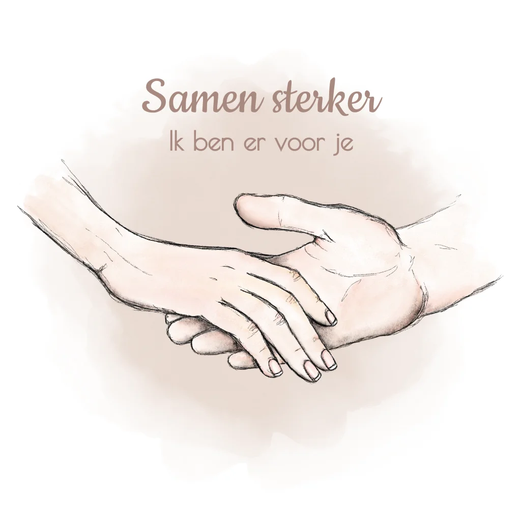 Laat iemand weten dat je aan hem of haar denkt met deze prachtige wenskaart. De tekening van twee volwassen handen die elkaar vasthouden, symboliseert steun, verbondenheid en kracht.