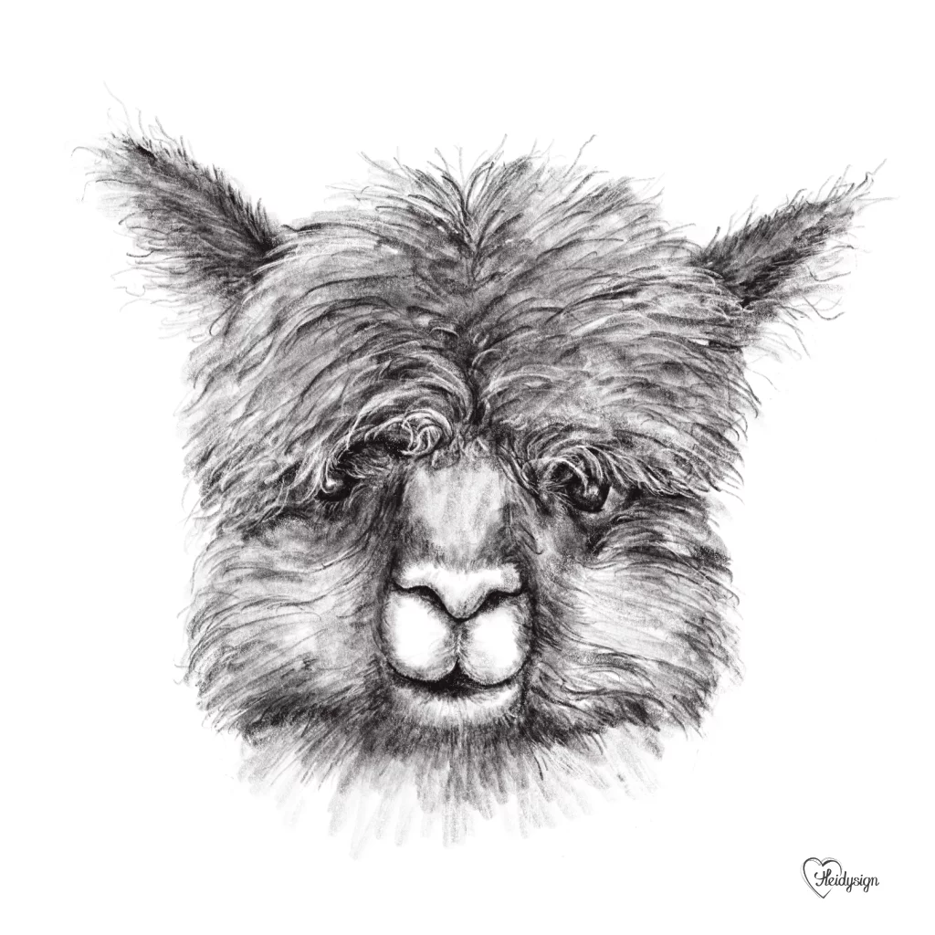 Dierenkaart met een potloodtekening van een grappige alpaca. Deze tekende ik nadat ik via social media had gevraagd welke dieren mensen graag getekend wilden zien. Dit schattige dier was 1 van de dieren die genoemd werd.