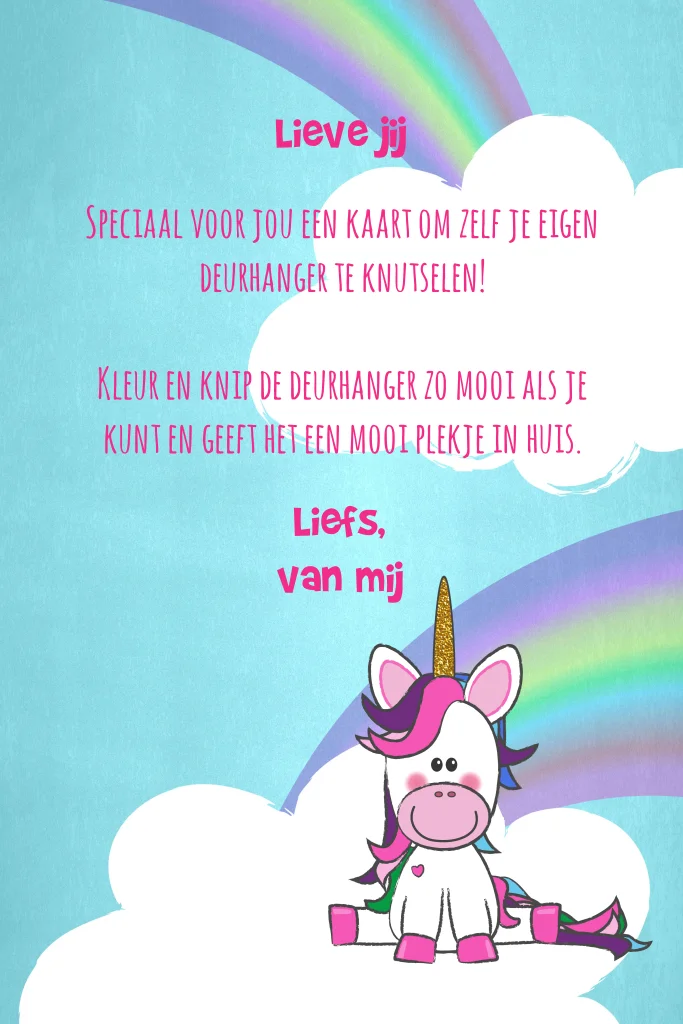 D.I.Y. Kleur- en knutselkaart. Vrolijke deurhanger met een unicorn, wolken en regenbogen. Welke knutselkampioen maak jij blij met deze leuke unicorn deurhanger? INFO: bij het bestellen van deze kaart kun je een papiersoort naar keuze aanvinken. Om deze kaart te kunnen kleuren kan het beste gekozen worden voor natuurkarton. En natuurlijk is een groter formaat extra leuk.