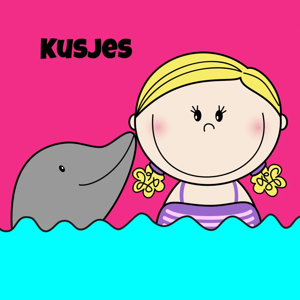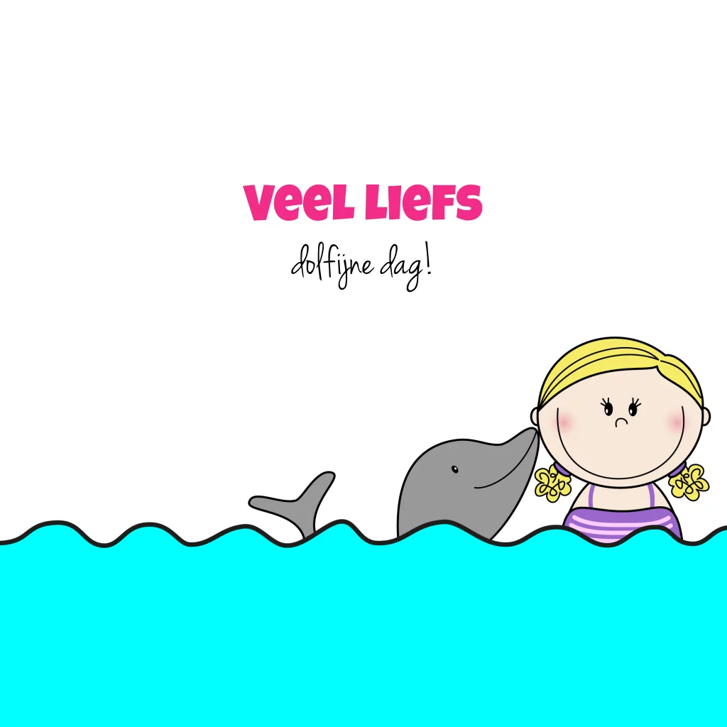 Een vrolijke kinderkaart met een illustratie van een lief dolfijntje, dat een meisje een kusje geeft.