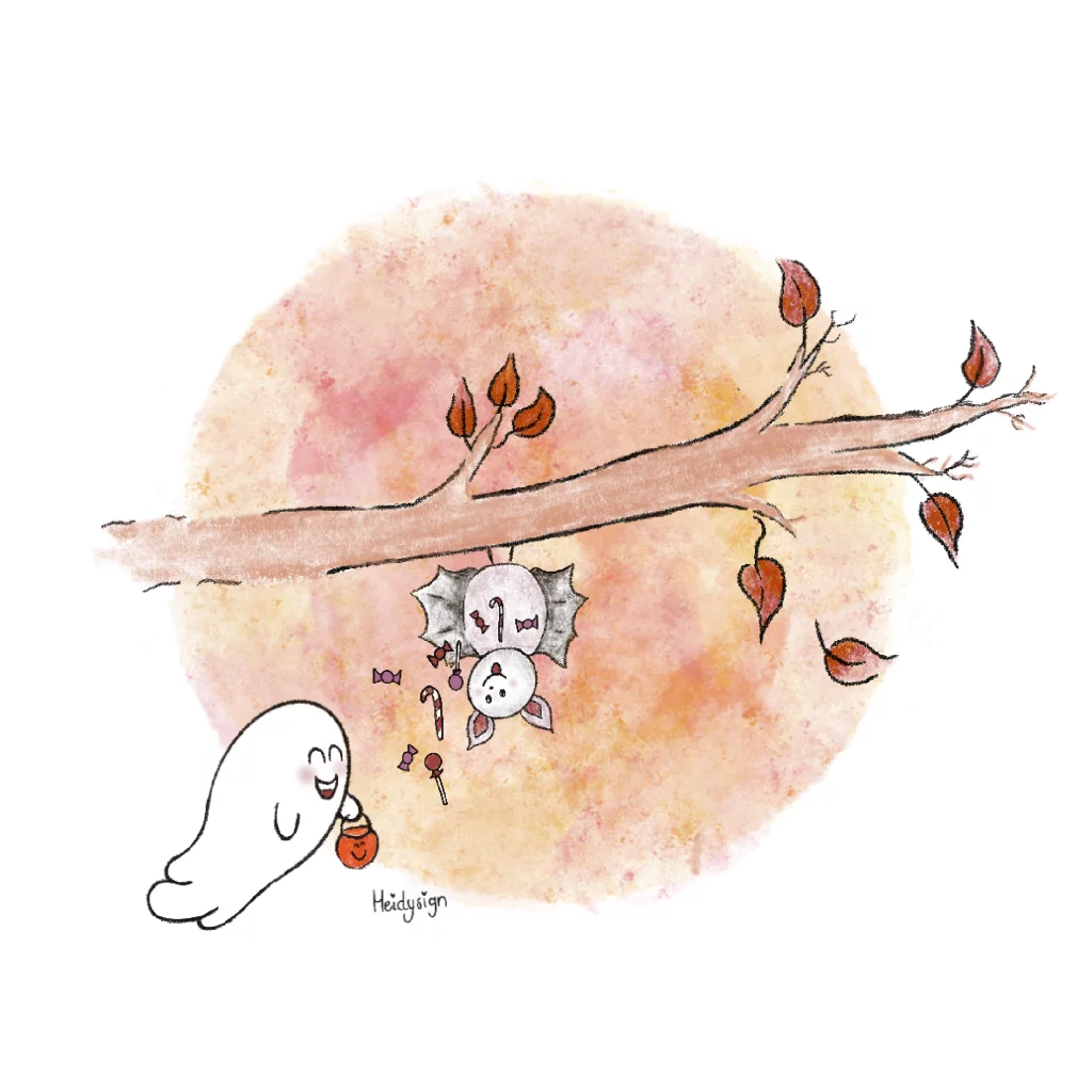 Lief wenskaartje voor de halloween of een ander leuk moment. Deze kaart heeft een tekening van een schattig spookje en vleermuisje met vele snoepjes. Je kunt deze wenskaart naar wens aanpassen en direct naar naar een gelukkige ontvanger laten verzenden.