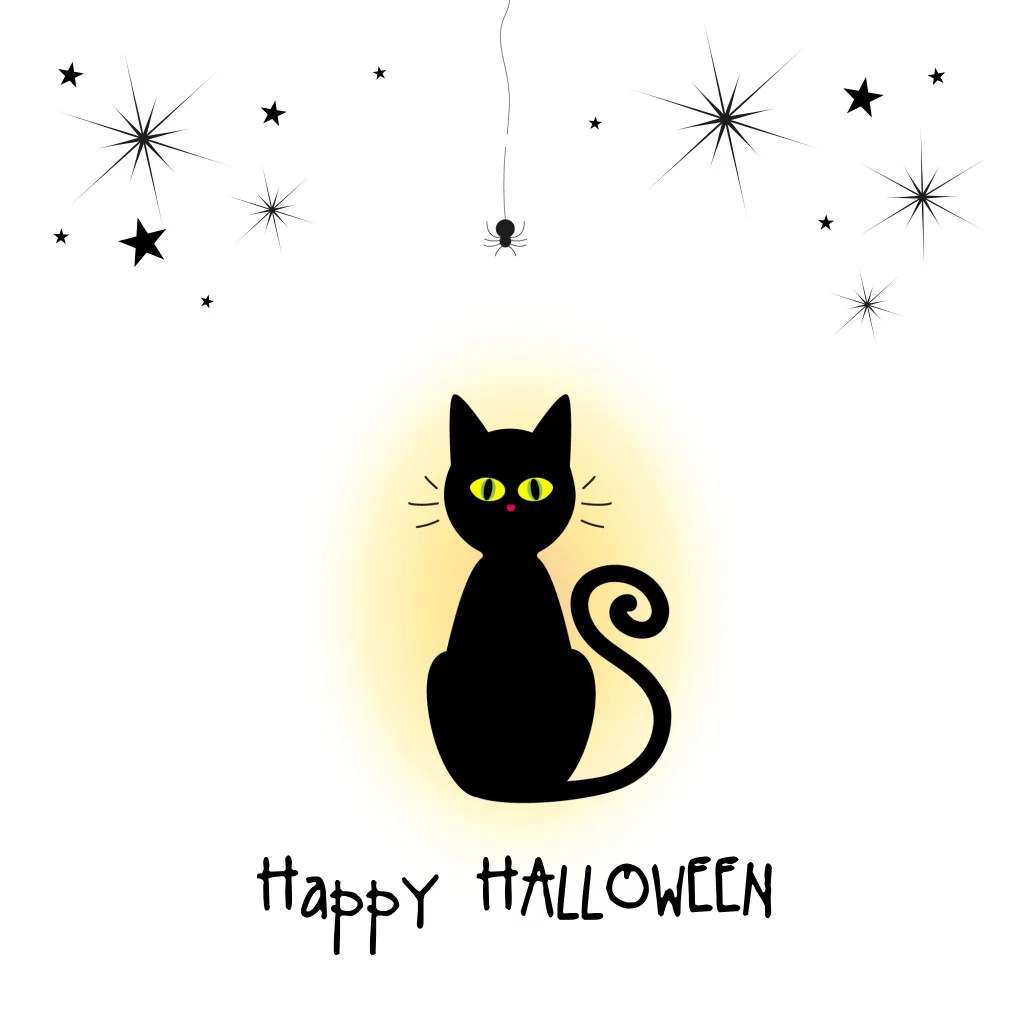 Greetingcard Halloween. Deze grappige Halloweenkaart heeft een illustratie van een zwarte kat en een spinnetje.