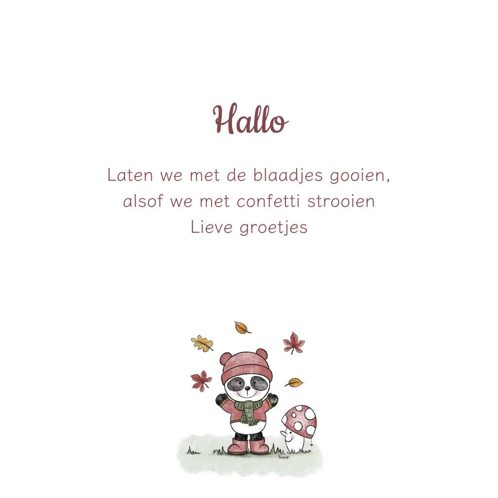Wat is de herfst toch magisch! Dit schattige pandabeertje geniet volop terwijl hij vrolijk met herfstblaadjes in de lucht gooit. Naast hem staat een grote paddenstoel waar een klein spinnetje aan bungelt – helemaal klaar voor een knusse herfstgroet! Pas de kaart zelf aan met jouw eigen tekst en laat ‘m direct versturen voor een extra leuke verrassing. De perfecte manier om iemand te verrassen in het gezellige herfstseizoen!