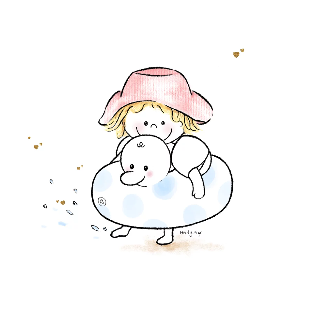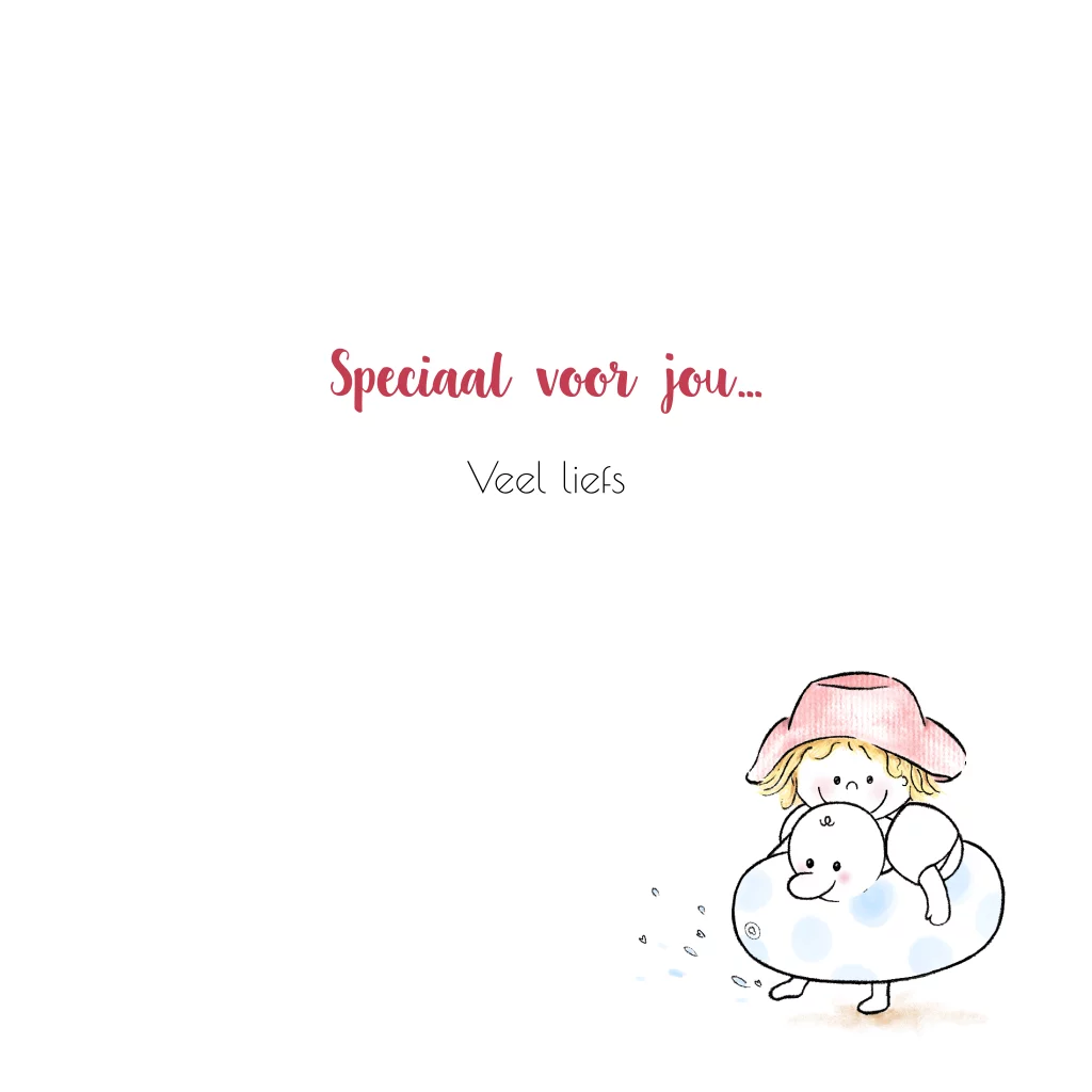 Kinderkaart met een tekening van een meisje met een zwembandje. Het meisje staat bij de zee en spettert met haar voetje. Aan de binnenkant van de kaart staat een klein gedichtje. Deze kun je zelf bewerken of verwijderen.
