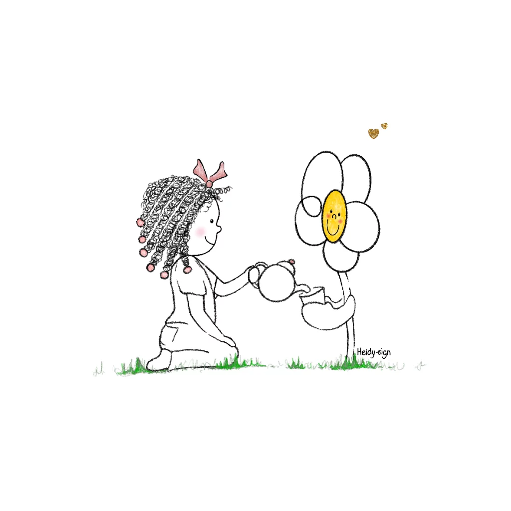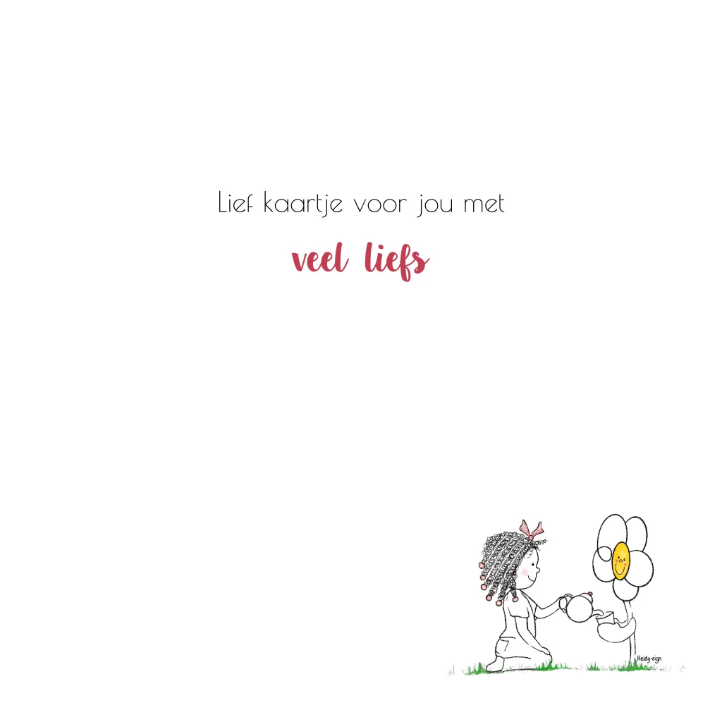 Leuke kinderkaart met een tekening van een meisje dat een bloem water geeft. Aan de binnenkant van de kaart staat een gedichtje. Deze kun je zelf nog aanpassen of verwijderen.