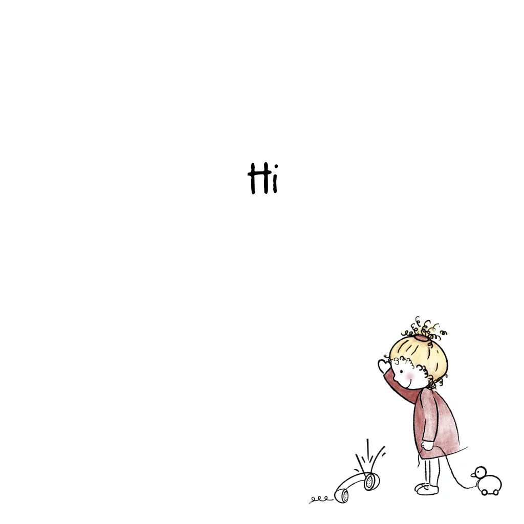 Kinderkaart om zomaar te versturen. Deze wenskaart heeft een tekening van een lief meisje dat zwaait naar de telefoon. Je kunt de tekst "Hi" naar wens aanpassen.