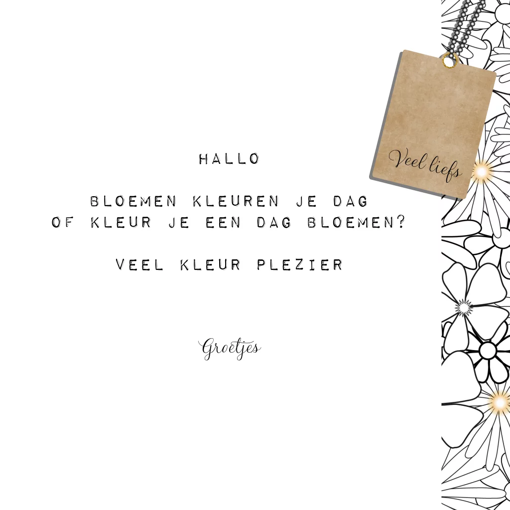 Kleurplaat kaart met bloemen. Bloemen kleuren je dag! Of kleur je een dag lang bloemen? :p Ken je iemand die van bloemen houdt en graag creatief bezig is? Met deze kleurplaat kaart kan de ontvanger zelf aan de slag en de kaart inkleuren.