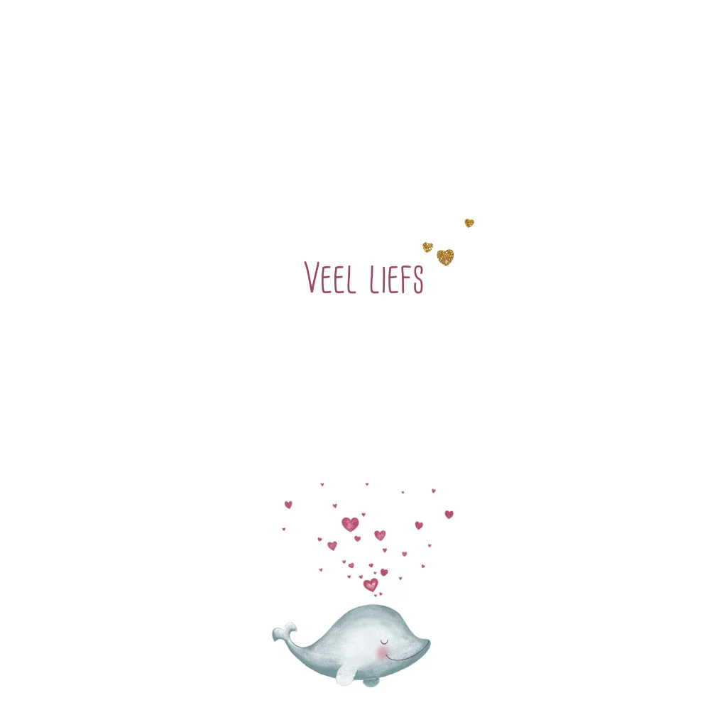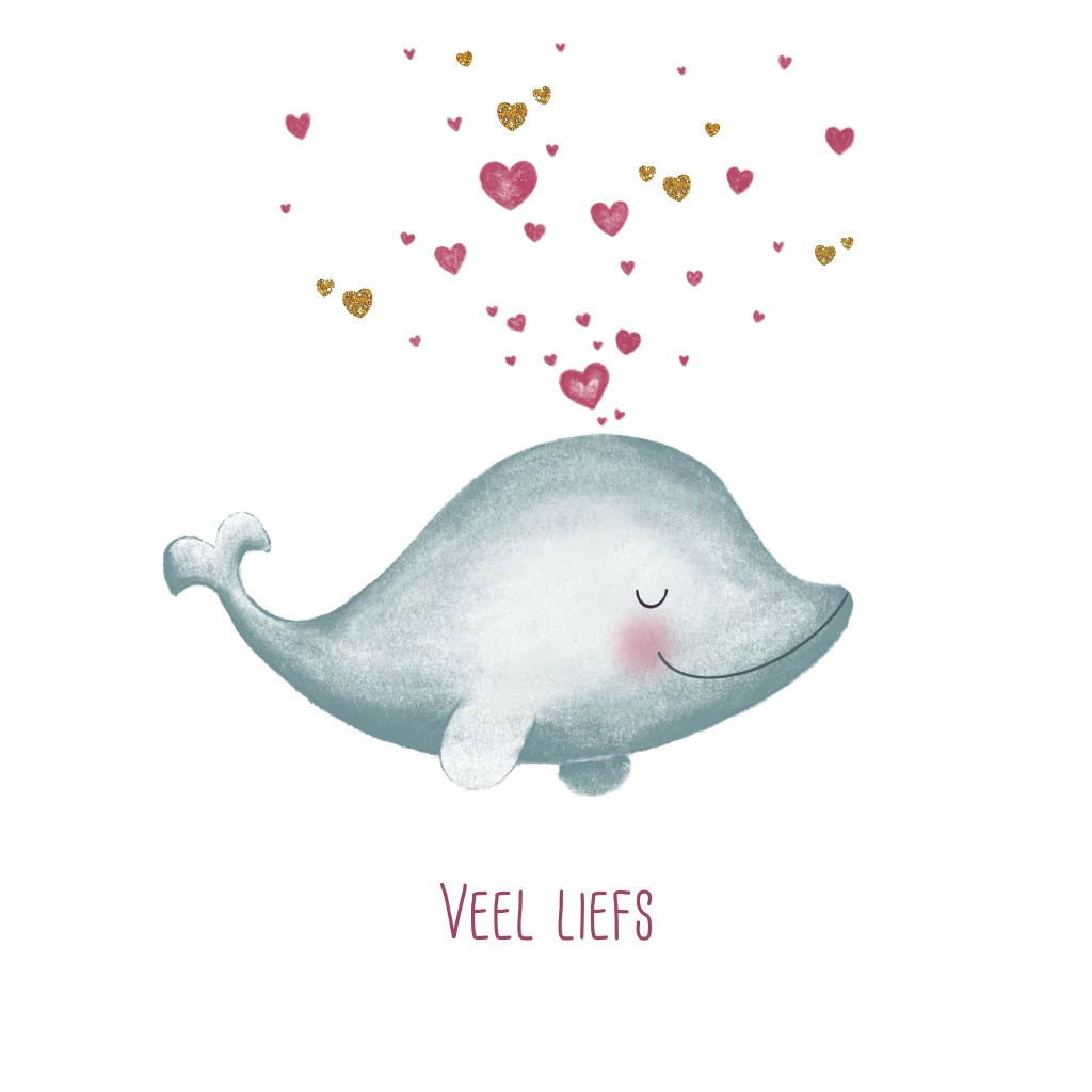 Veel liefs. Schattige wenskaart met een tekening van een lief dolfijntje met vele hartjes.