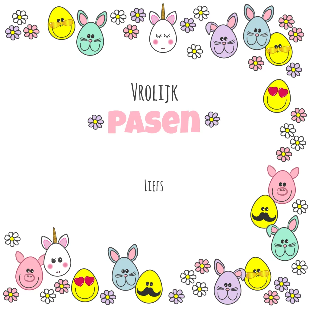 Paaskaart met je eigen foto en een vrolijke fotokader van bloemen en emoji-icoontjes paaseitjes. De foto is gemakkelijk te vervangen.