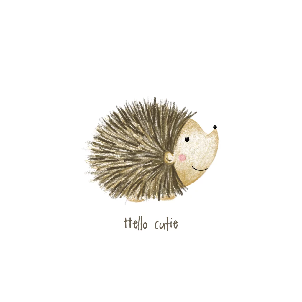 Schattig kaartje "Hello cutie" met een tekening van een lief egeltje. Leuk om zomaar te versturen of als felicitatie voor de geboorte van een baby.