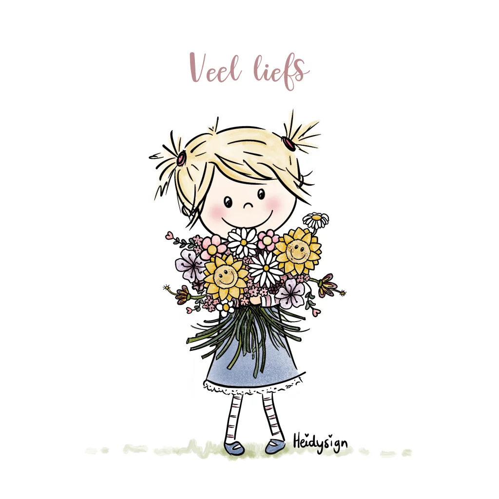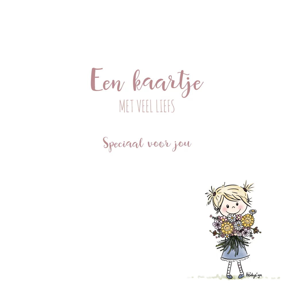 Schattige kaartje om zomaar te versturen naar iemand die je lief vindt. Deze kaartje heeft een tekening van een lief meisje met met een hele grote bos bloemen. Pas deze kaart naar wens aan en verras iemand met dit lieve kaartje in de brievenbus.