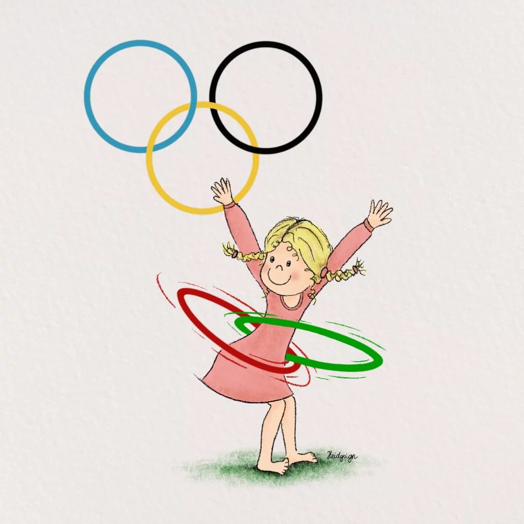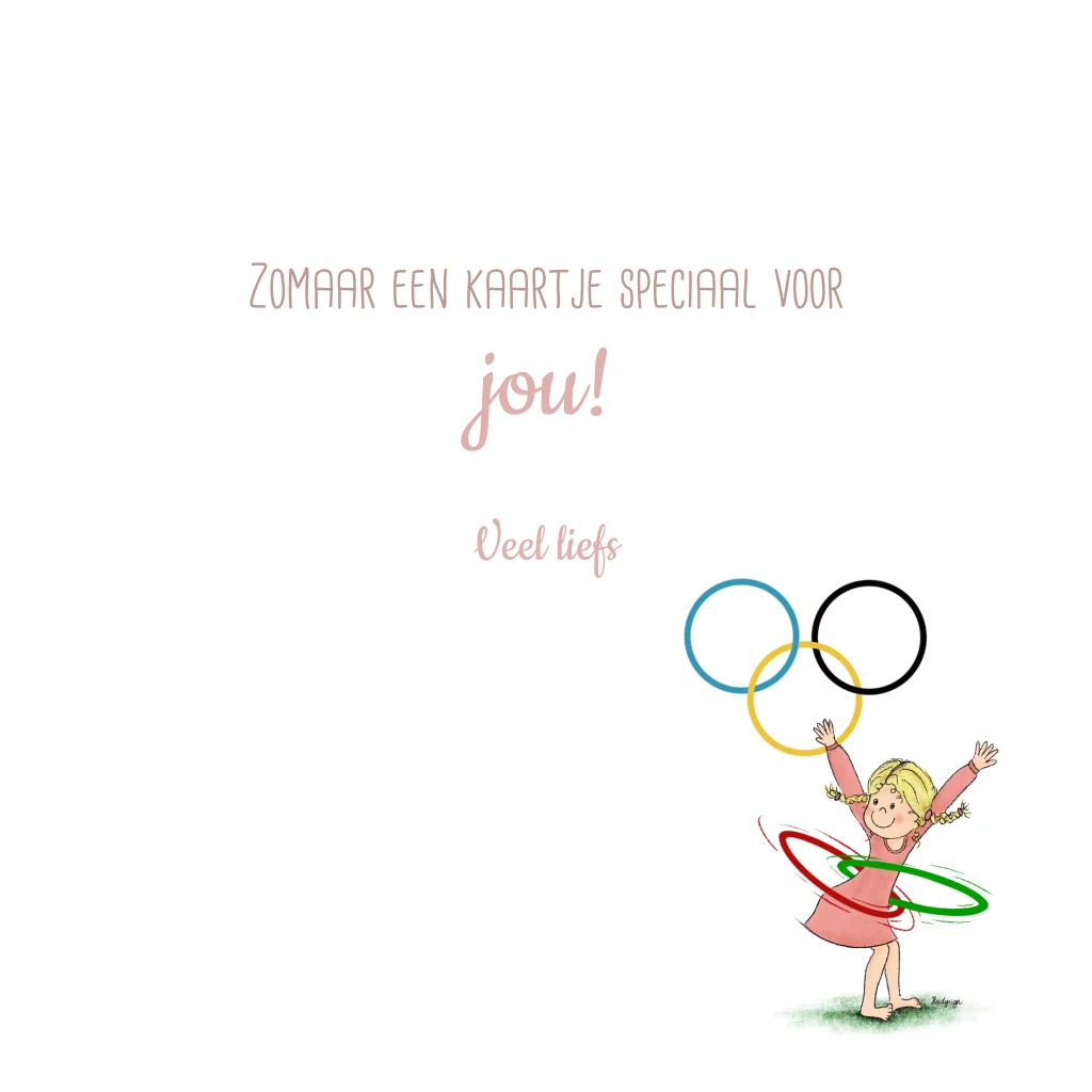 Deze speelse olympische spelen wenskaart toont een meisje dat twee van de Olympische ringen heeft gepakt en daarmee aan het hoelahoepen is. De kleurrijke en fantasierijke illustratie brengt een glimlach op ieders gezicht en is perfect voor elke gelegenheid. Voeg je eigen boodschap toe om de kaart persoonlijk en speciaal te maken. Laat ons de kaart rechtstreeks naar de ontvanger sturen voor extra gemak. Of je nu iemand wilt feliciteren, succes wilt wensen, of gewoon een vrolijke groet wilt sturen, deze kaart zorgt gegarandeerd voor een glimlach!